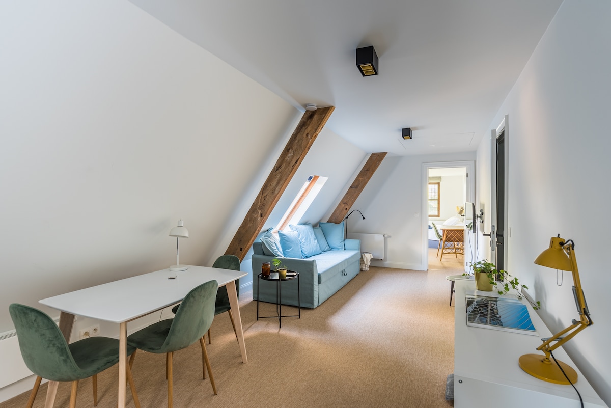 Apartamento de 1 dormitorio en una calle tranquila en el ático de un castillo donde vivimos. A 5 minutos a pie de los transportes que ofrecen acceso directo al centro de la ciudad (35-40 minutos). WC y baño separados Incluye una cama doble para 2 personas y un sofá cama para alojar hasta 4 personas. Si desea abrir el sofá poner 3 personas en la reserva ⚠️está en el 3er piso y no hay ascensor. Estacionamiento gratuito a 5 minutos a pie de la casa.⚠️ no se permiten visitantes por la noche