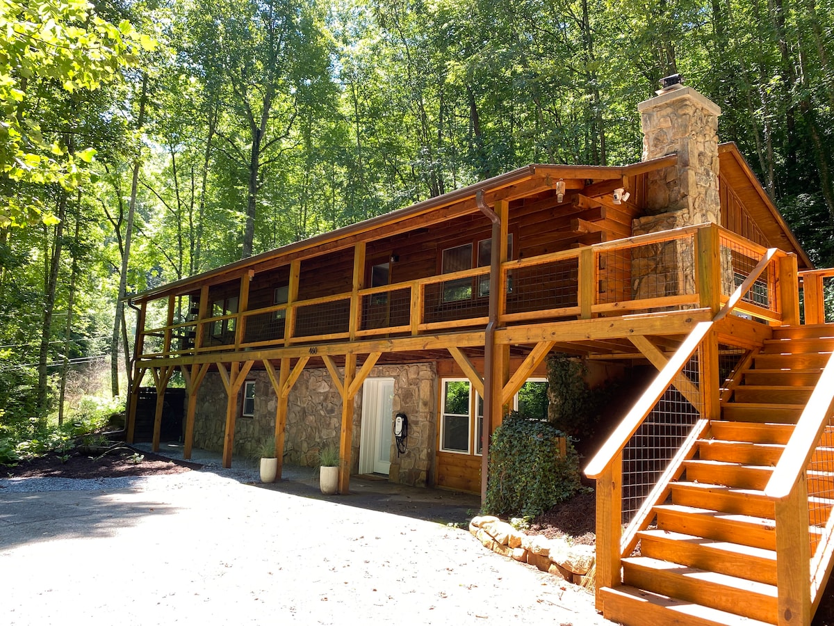 Nuestra cabaña fue construida desde hace más de 50 años y totalmente renovada en 2021. Estamos ubicados a 40 millas del aeropuerto de Asheville; a poca distancia en auto de la estación de esquí, Blue Ridge Parkway, Harrah 's Casino y Biltmore Estate. Senderismo, esquí y aguas termales están cerca. Relájate en el porche o haz una barbacoa cerca del fogón. Amplia cocina para comidas familiares; baños en ambos niveles y varias zonas de reunión. Acurrúcate junto a la chimenea de gas, pon un disco o disfruta de un rompecabezas en el rincón. Fácil acceso, enchufe 14-50 para vehículos eléctricos.