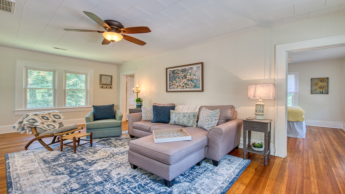 El mismo alojamiento, diferentes sitios web: ¡ahorra en las comisiones! Pista: No solo estamos en Airbnb 😉Alójate en un pedazo de historia en Historic Shelton House Carriage House, gestionado por Carolina Mountain Vacation Homes. A solo 3 manzanas del centro de Waynesville, esta encantadora suite en la planta superior ofrece 1 cama tamaño king, 1 cama tamaño queen, Roku TV, wifi Spectrum y vistas a la montaña. Se admiten mascotas para un perro pequeño. ¡Camina hasta las tiendas, cervecerías y el mercado de agricultores!