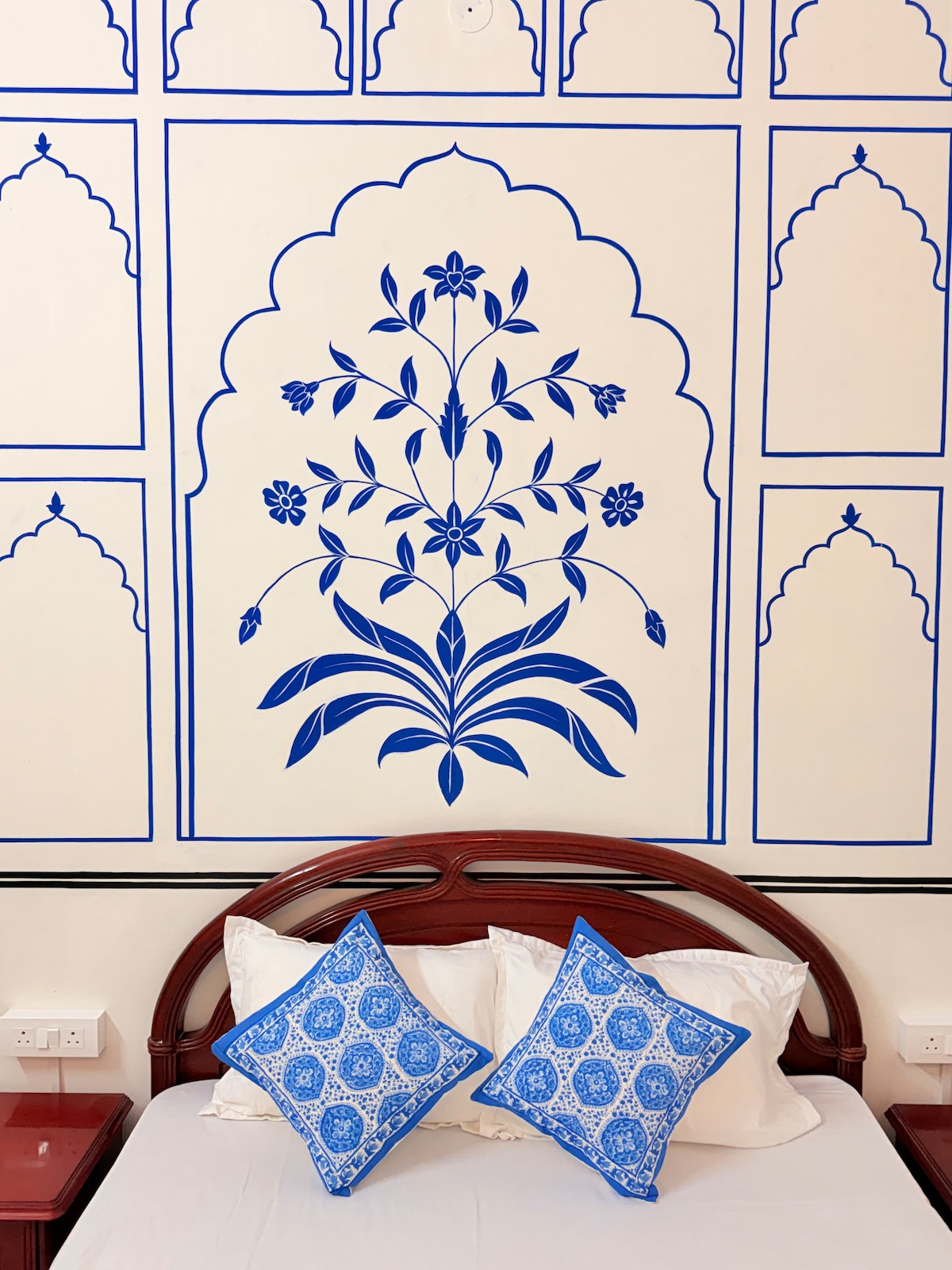 Step into a living sketchbook in the Princess Suite by Lalluji Luxe. Reimagined as a 2D Sheesh Mahal, this monochrome suite features hand-painted walls and authentic Tikari mirror work. Relax in a hot tub beneath a “Sheesh Mahal” ceiling as reality dissolves. Savor yourself with authentic home-cooked meals and relax on the artistic balcony. At Lalluji Luxe, you don’t just stay—you become part of the masterpiece.