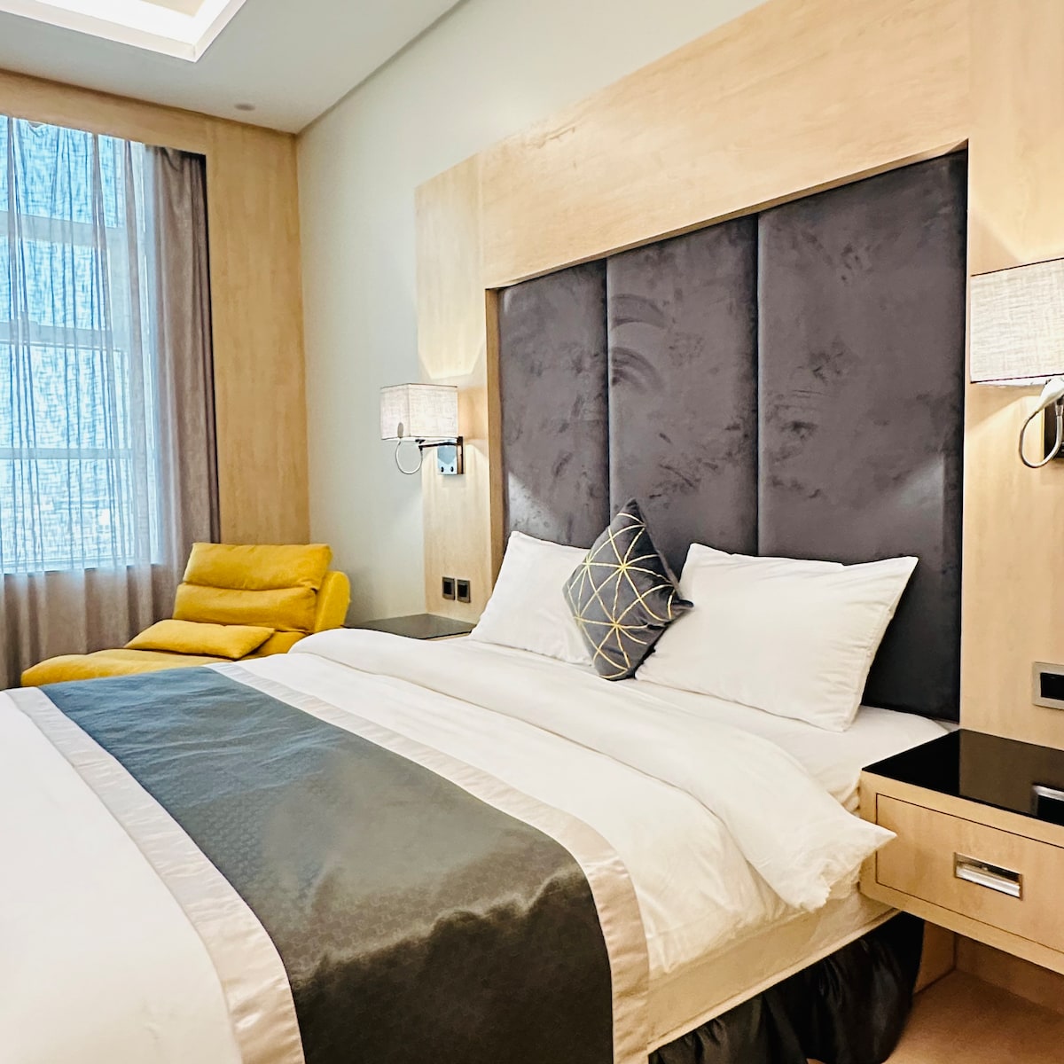 Habitación de hotel elegante y lujosa y salón con muebles perfectos para la relajación, la comodidad y la tranquilidad con registro de entrada autónomo Ubicado cerca de lugares turísticos Ubicación muy destacada A 15 minutos del aeropuerto Todos los servicios de alojamiento están disponibles Internet abierto disponible a 200 Mbps Suscripción VIP de testigo Suscripción a Netflix Detalles del lugar: Dormitorio con cama principal, asientos laterales, sala de estar de diseño moderno y elegante, gran pantalla inteligente y baño de diseño elegante Un rincón de café con hospitalidad de cortesía diseñado para satisfacer todas las necesidades del huésped y vivir una experiencia única y distintiva en Jazan