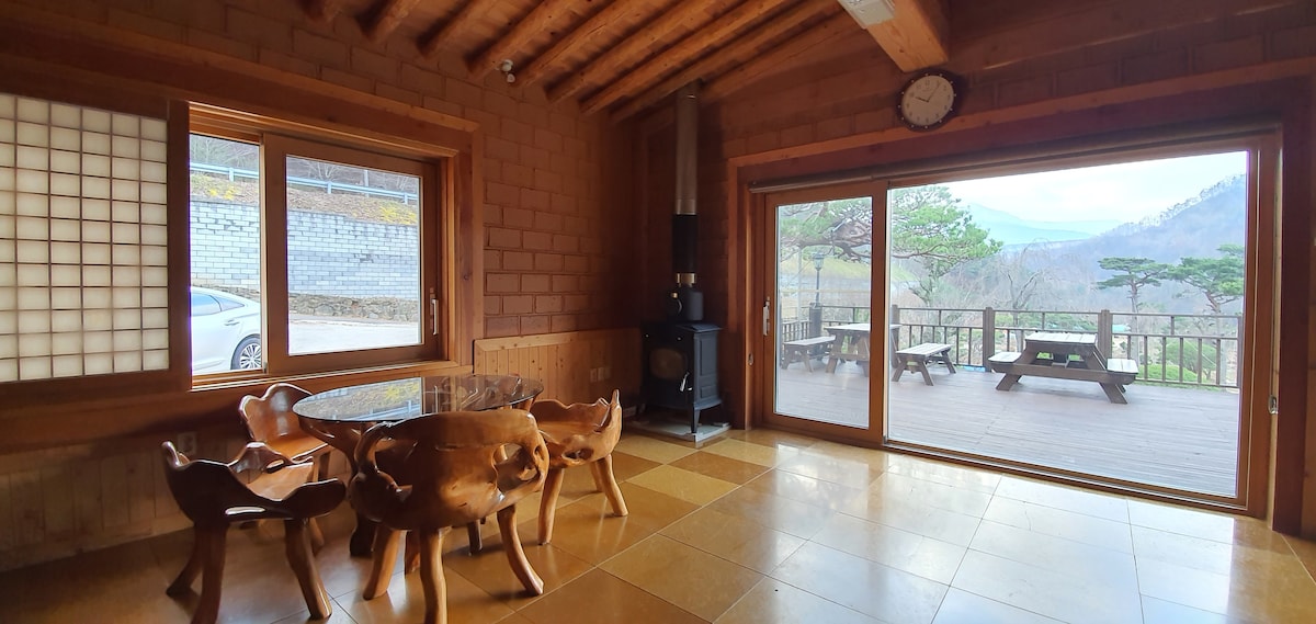 Situado en el centro de Gombuldong, la habitación es de tatami y cama, y la sala de estar tiene una chimenea, por lo que es un espacio cálido y acogedor, ideal para que las parejas y familias se relajen. En el frente, se puede ver el monte Hamyang, el monte Duryubong, el monte Hahoe, el monte Cheonwang, el monte Nogodan, y en la parte posterior, se encuentra el monte Lawhwa, el monte Jiri, la primera puerta y el monte Odoje. Cuando llueve o hay cambios de temperatura, se puede disfrutar de un mar de nubes en el Himalaya. Cuando vengas, te sorprenderás al ver que hay lugares como este. Gracias. .