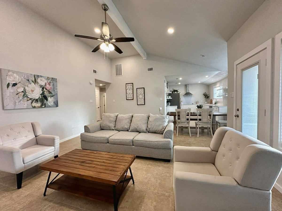 Ubicación, ubicación, ubicación: nuestra moderna casa de huéspedes está justo en medio del histórico Heights, a pocos pasos de la calle 19 y del sendero para caminatas y bicicletas Heights. Ya sea que te quedes una noche o hagas un viaje prolongado, te sentirás como en casa con una cocina totalmente equipada, cama tamaño king, TV inteligente de 65 pulgadas con cable de transmisión, wifi de alta velocidad, lavadora/secadora, estacionamiento fuera de la calle y entrada privada.