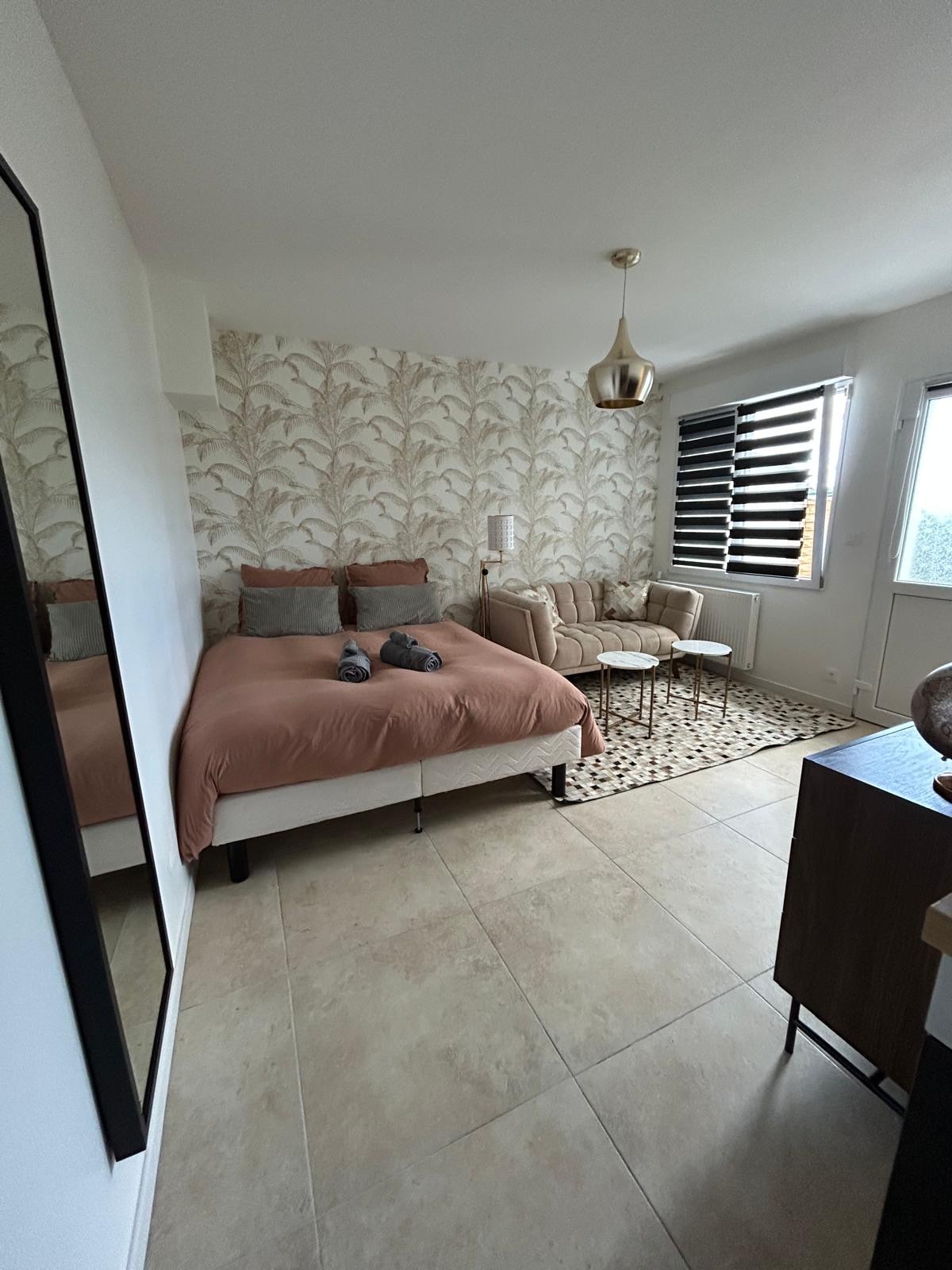 logement 45 M² comprenant une chambre ,cuisine équipée, une pièce de vie avec canapé lit,salle de douche avec WC. La capacité d’accueil est de 4 couchages. Le logement refait à neuf est situé au sein d’un manoir du 16 et 17 ° siècle, dans un lotissement privé, au calme, avec vue sur un parc boisé. Quartier des 2 LIONS de TOURS, vous serez à 15mn en tramway du centre de Tours (arrêt du tramway à 300 mètres). Espace extérieur avec table et chaises pour profiter de la douceur tourangelle