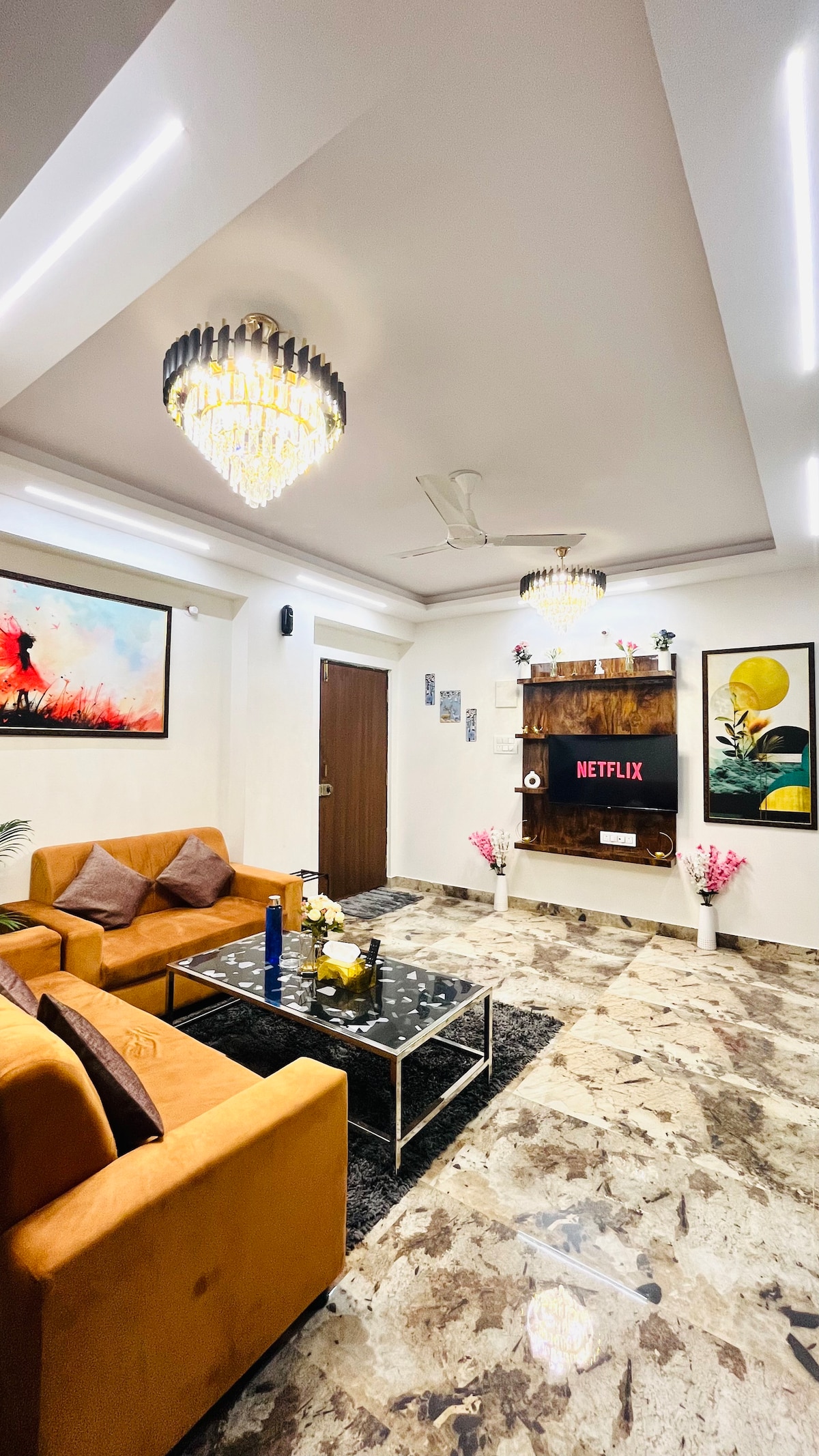 This peaceful and centrally located Private Suite room with small Pantry - Perfect for Couples, Families or Business Stays Enjoy a comfortable stay in this stylish private suite featuring a terrace garden, perfect for relaxing after a busy day. The space includes a 43 inch Smart TV, high-speed Wi-Fi, and a work desk with chairs, ideal for both leisure and work. Kitchen is equipped with a microwave, toaster, kettle, induction cooktop & minibar, making it easy to prepare light snacks only.