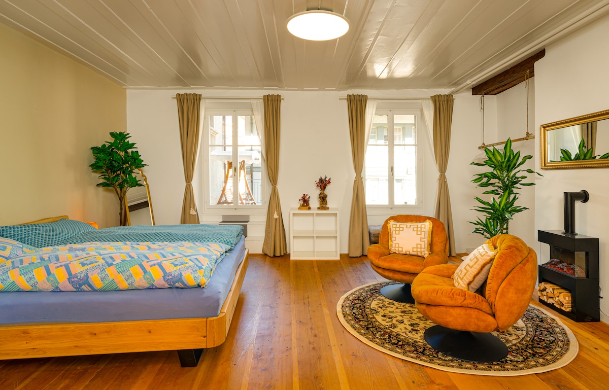 Cerca del lago Biel, este moderno loft de diseño industrial se presenta en una superficie de 140 m² decorado con antigüedades y objetos raros de alta calidad. En la galería, a la que se accede por una escalera, se puede dormir cómodamente con vistas a todo el loft (no se admiten mascotas en la galería). Las instalaciones incluyen un baño privado con bañera y ducha, así como una cocina totalmente equipada. Hay un aparcamiento y un pequeño jardín disponibles.
