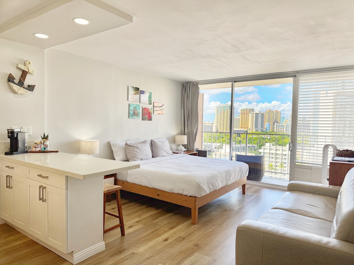Beautifully renovated and furnished Studio at Marine Surf Waikiki. On the 17th floor with views of the World Famous Waikiki and peekaboo views of the ocean. This studio is furnished with a king size memory foam bed with your own full kitchen to make meals if one chooses to stay in and relax on the lanai. Pool on the 4th floor and laundry on every floor starting from the 4th up. Self checkin and checkout process by way of a combination mailbox lock.