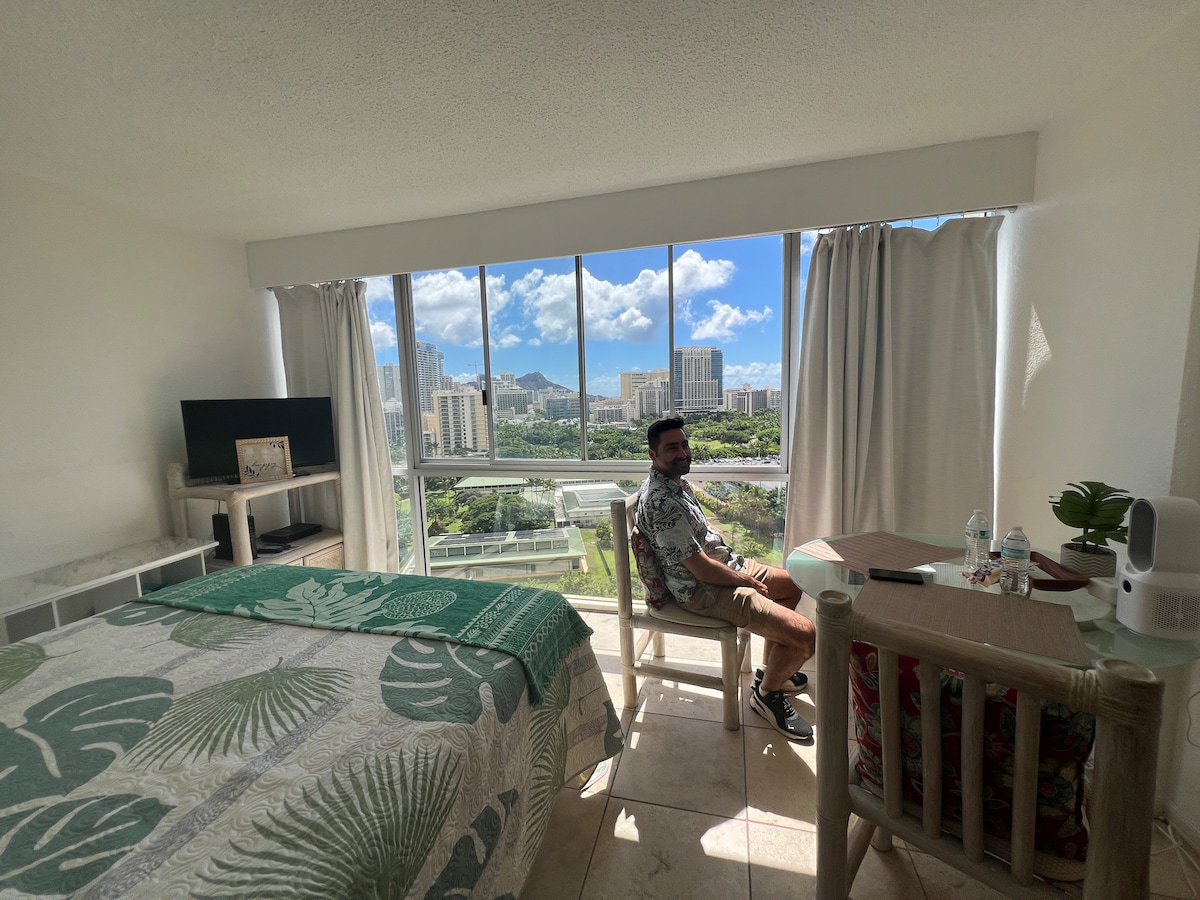 NEW! Waikiki City View Studio. This newly renovated studio offers 382 sq. ft. of stylish living space with a spacious lanai, where you can enjoy breathtaking city&Koolau mountain views and enjoy your meal. Sleeping Arrangements: • King-size bed for ultimate comfort • Two twin-size Japanese-style futons Kitchenette Amenities: • Electric kettle with complimentary ground coffee and hibiscus tea • Portable induction stovetop for light cooking • Dinner plates, bowls, microwave, and wine cellar