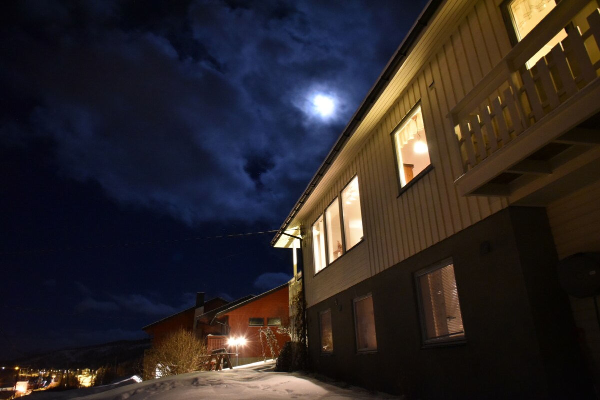 Disfruta de las vistas y de las auroras boreales desde el balcón o relájate en la bañera de hidromasaje. Uso gratuito de lavadora, secadora, bañera de hidromasaje, toallas, ropa de cama, detergentes, cocina y TV por cable/internet 2 dormitorios con camas dobles para un total de 4 personas. Cómodo colchón inflable de aire alto auto inflable (90x200x40 cm) para un quinto huésped, se puede poner en el dormitorio o en la sala de estar. Estacionamiento gratuito para un auto. Entrada en la parte trasera de la casa con escaleras hasta el apartamento.