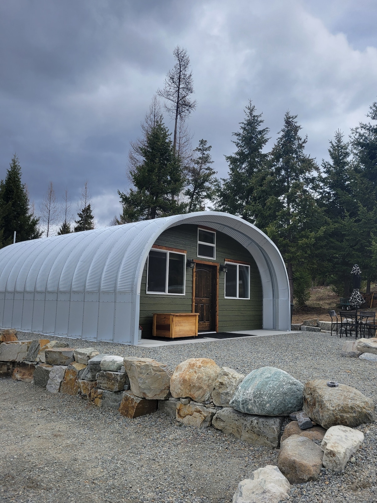 Cabaña Quonset en el bosque, con vistas a las montañas