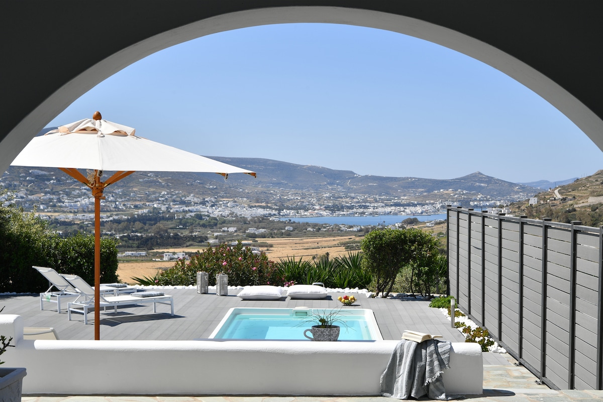 Villa Blue Pearl es una propiedad de 1 dormitorio con piscina privada que se encuentra en Elitas, una pequeña colina a solo 3,5 km de Parikia, la capital de Paros y el puerto. Nuestra villa es totalmente independiente y tiene una vista sin obstáculos al mar y al puerto de Parikia. Nuestra piscina privada ofrece a nuestros huéspedes momentos de relax sentados en nuestros sofás integrados de gran tamaño. También ofrecemos a nuestros huéspedes nuestros productos caseros. Es un placer para nosotros si eliges nuestra villa para tus vacaciones en Paros.