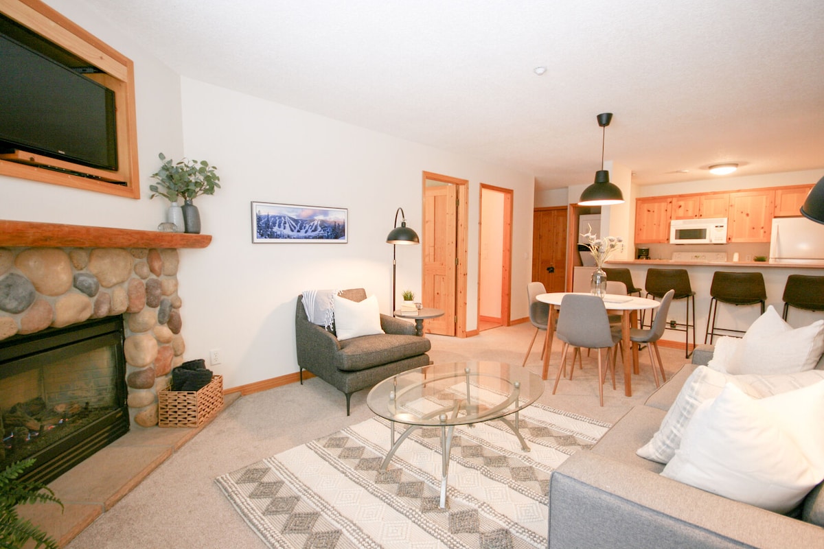 Nuestro apartamento de dos dormitorios y dos baños cuenta con una cama tamaño king en el dormitorio principal, literas dobles en el segundo dormitorio, suelos de baldosas con calefacción en los baños y cocina totalmente equipada, chimenea de gas acogedora, TV inteligente de 55 pulgadas en la sala de estar y TV inteligente de 42 pulgadas en el segundo dormitorio, internet inalámbrico, un nuevo jacuzzi J425, parrilla, lavadora/secadora y vistas espectaculares.