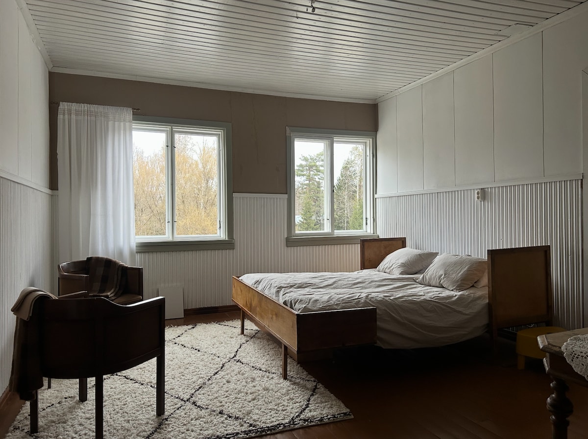 Una cabaña de madera idílica al final de un camino junto a un lago. La cabaña está bien equipada y es adecuada para su uso durante todo el año. Cocina y cabaña, chimenea, alcoba para dormir y dos camas individuales en el loft de arriba. Posibilidad de alquilar una habitación al aire libre para dos personas además. (4+2) La cabaña tiene electricidad y agua corriente de un pozo. Sauna y ducha de leña. En el área del patio, hay una bañera de hidromasaje privada (uso por un cargo adicional) y una cabaña de barbacoa, así como un aseo al aire libre. Barco de remos antiguo disponible.
