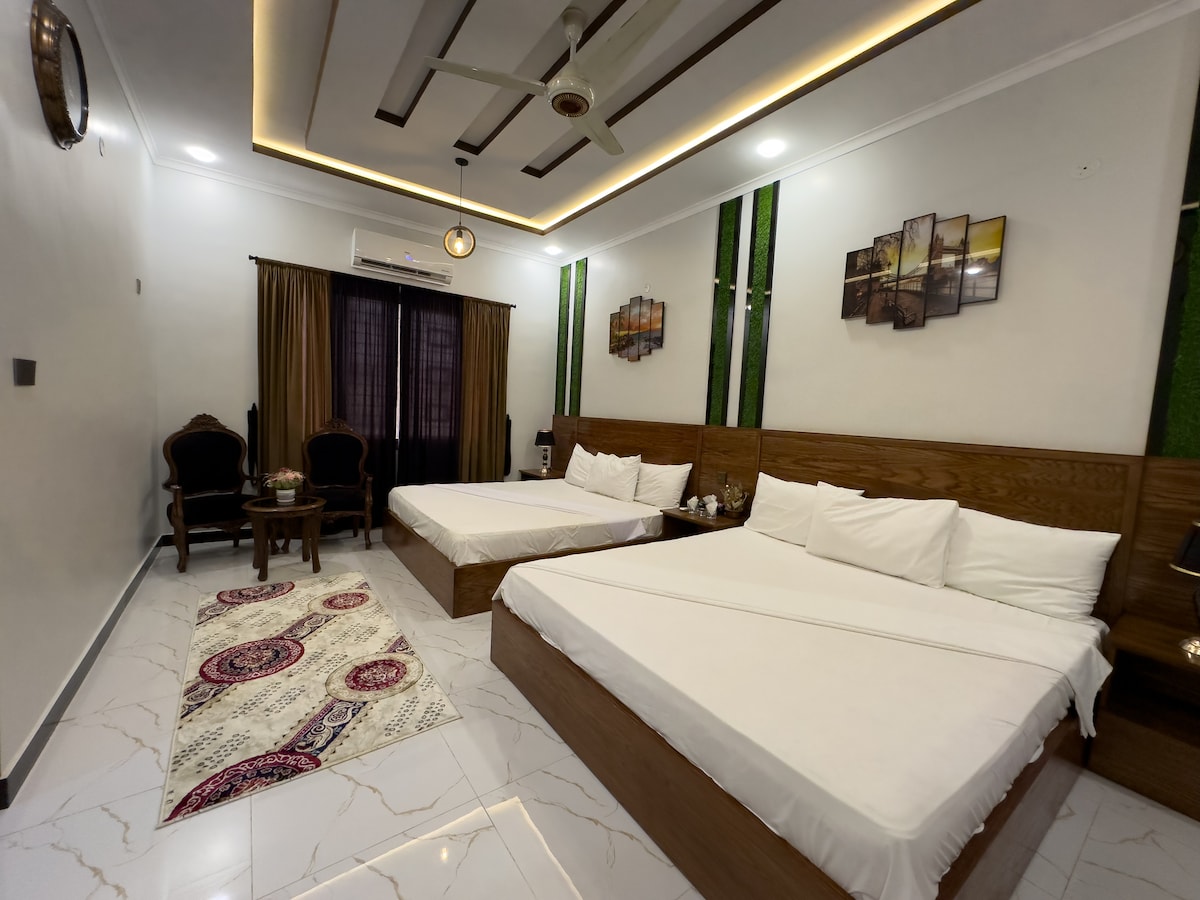 Ubicada en el corazón de Karachi, nuestra casa de huéspedes ofrece un refugio tranquilo en medio del bullicio de la ciudad. Disfruta de acceso exclusivo a nuestra hermosa zona al aire libre, una característica poco común en los Airbnb de Karachi, perfecta para relajarte y escapar. Mejores ventajas: • Delicioso desayuno gratuito para empezar el día. • Guía de viaje para explorar Karachi como un habitante más. • Proximidad a centros comerciales, restaurantes, universidades, gimnasios, cajeros automáticos y hospitales. • Alojamiento seguro y protegido con un ambiente hogareño. Traslado desde el aeropuerto.