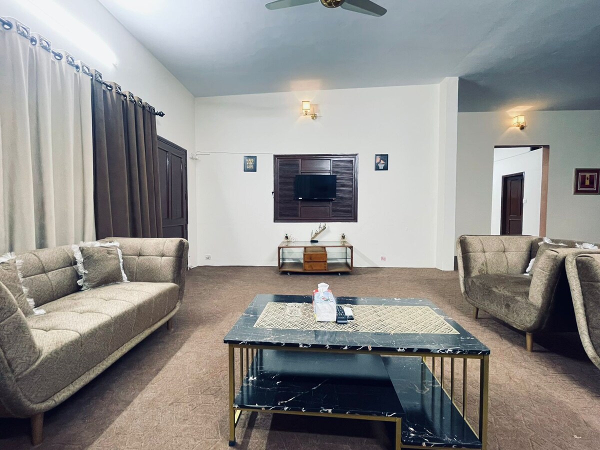 Relájese con toda la familia en esta tranquila y espaciosa casa de huéspedes, totalmente alfombrada, situada justo detrás de University Road. Cerca de la Universidad NED, la Universidad de Karachi y el centro comercial Samma, y a solo 15 minutos en auto del Aeropuerto Internacional Jinnah. El alojamiento cuenta con 4 habitaciones (3 con baño en suite), un salón amplio, una cocina totalmente equipada con cafetera, Wi-Fi, estacionamiento seguro, seguridad las 24 horas, los 7 días de la semana, e interiores limpios. Ideal para familias. Terraza disponible (no se permiten eventos).