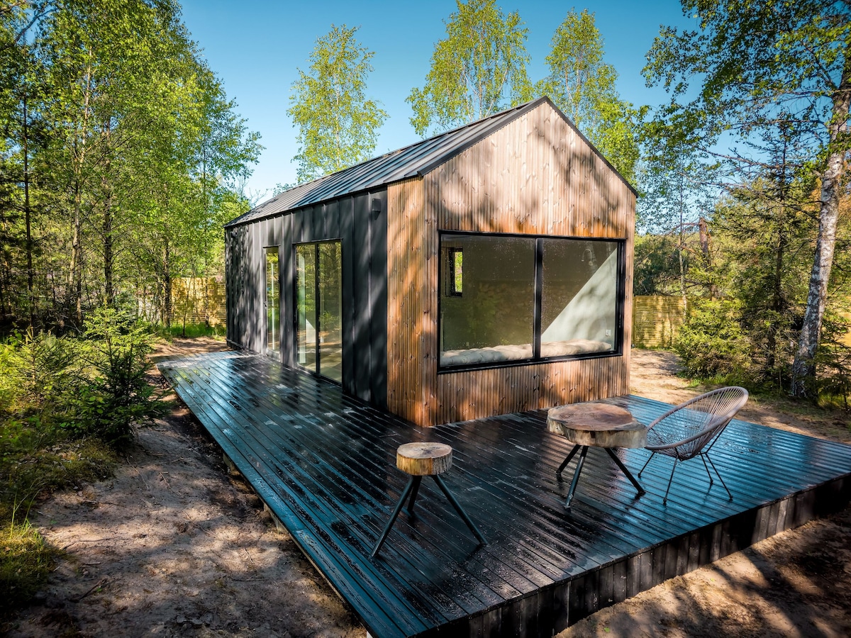 Sumérgete en la magia de la naturaleza eligiendo alojarte en la cabaña "Papla", un espacioso oasis de tranquilidad de 35 metros, creado pensando en tu comodidad y relajación. Una elevación hecha de una tabla brillante, se combina perfectamente con el bosque circundante, creando un todo armonioso. El enorme acristalamiento frontal con una cómoda zona de estar te permite disfrutar de las hermosas vistas del bosque, y la ventana lateral también ilumina el interior, añadiendo calidez y comodidad.