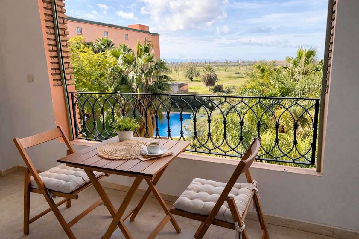 ✨ Appartement élégant et lumineux à Hivernage ✨ Situé à Hivernage, dans une résidence calme et sécurisée, avec piscine. Chambre confortable, salon chaleureux, cuisine équipée et salle de bain moderne. 🌞 Balcon sud-ouest ensoleillé avec vue sur la piscine, les espaces verts et vue lointaine sur les montagnes par temps clair. 📍 Très proche Menara Mall, restaurants et commodités. Idéal couple, solo ou pro.