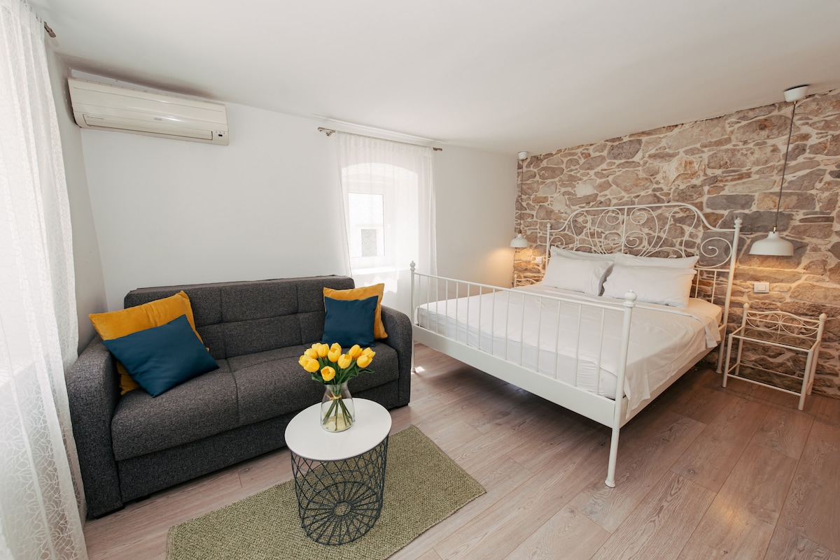 Bienvenido a un encantador apartamento ubicado en el corazón del histórico Kaštel Lukšić, dentro de una casa de piedra tradicional que está catalogada como un monumento cultural. Este alojamiento único es una mezcla de auténtico espíritu dálmata y comodidad moderna, ideal para los huéspedes que quieren sentir el verdadero ambiente del Mediterráneo. El departamento está ubicado en el centro del casco antiguo, rodeado de estrechas calles de piedra y un rico patrimonio cultural e histórico.