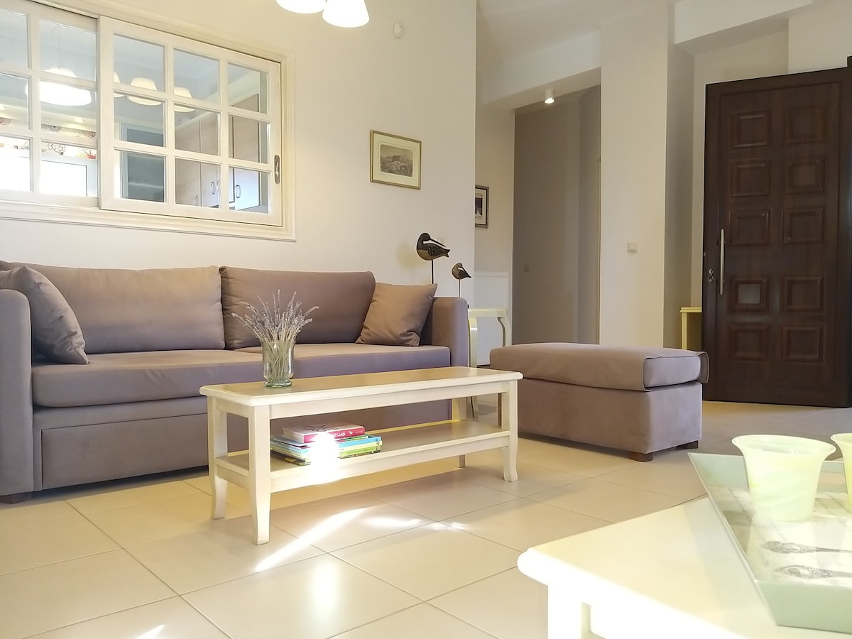 Luminoso, elegante, independiente y totalmente equipado, este elegante apartamento de 83 m² con aire acondicionado puede satisfacer las necesidades de 1 - 6 viajeros. Ideal para familias, parejas, amigos y profesionales. Está construido en la ciudad de Kalamata, en un barrio tranquilo, en una planta baja elevada con entrada propia. Muy bien situado, muy cerca del mar/centro de la ciudad/ la nueva autopista para acceder rápidamente a los lugares históricos y turísticos más famosos alrededor de Kalamata. Wi-Fi/estacionamiento gratis en todo momento.