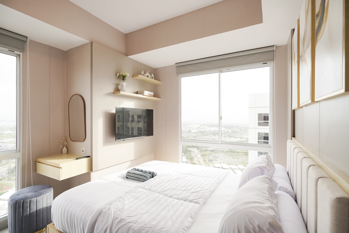Experience a cozy minimalist escape at Tokyo Riverside PIK 2, where modern design meets comfort. Perfect for solo travelers or couples, this stylish studio offers a queen bed, kitchen, smart TV, and Wi-Fi — ideal for work or rest. Just a 1-minute walk to an open-air mall, supermarket, and 90+ cafés and restaurants, with Aloha Pantai Pasir Putih, Pantjoran PIK, NICE PIK 2, and more nearby. Clean, comfy, and convenient — your perfect stay near the airport.