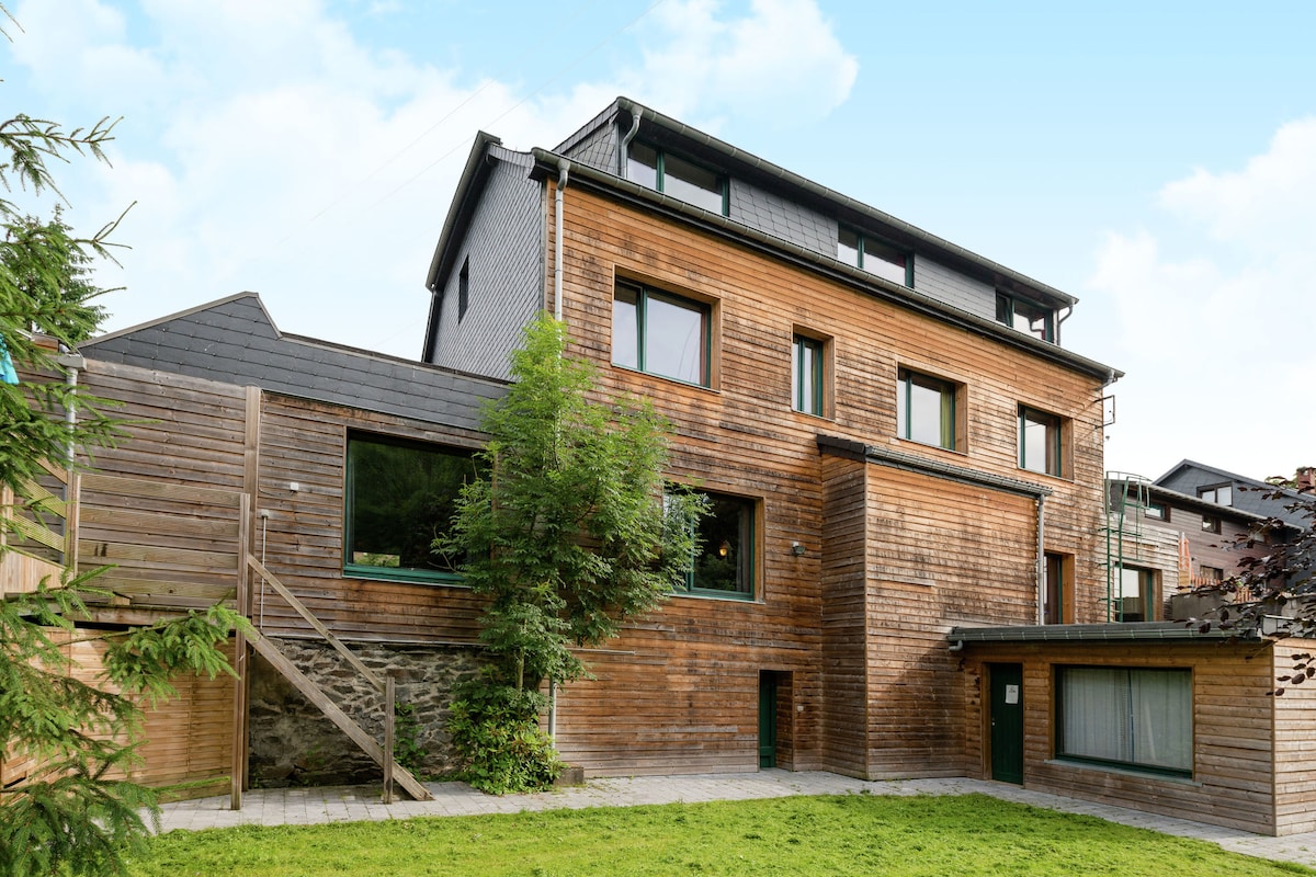 Ubicación ideal para los visitantes de la feria El mejor alojamiento para unas vacaciones en familia Aprox. 130 m² de superficie habitable en 2 plantas Amplia terraza con vistas elevadas al jardín/bosque y acceso privado al bosque Gimnasio Sauna finlandesa para 6 personas (con cargo adicional) Cocina americana profesional con mesa de comedor para 6 personas y TV Comedor formal con mesa para 6 personas Habitación grande con dos camas dobles y baño privado en el primer piso Dormitorio principal y segundo dormitorio en la planta baja con baño Televisores inteligentes en todos los dormitorios y la cocina