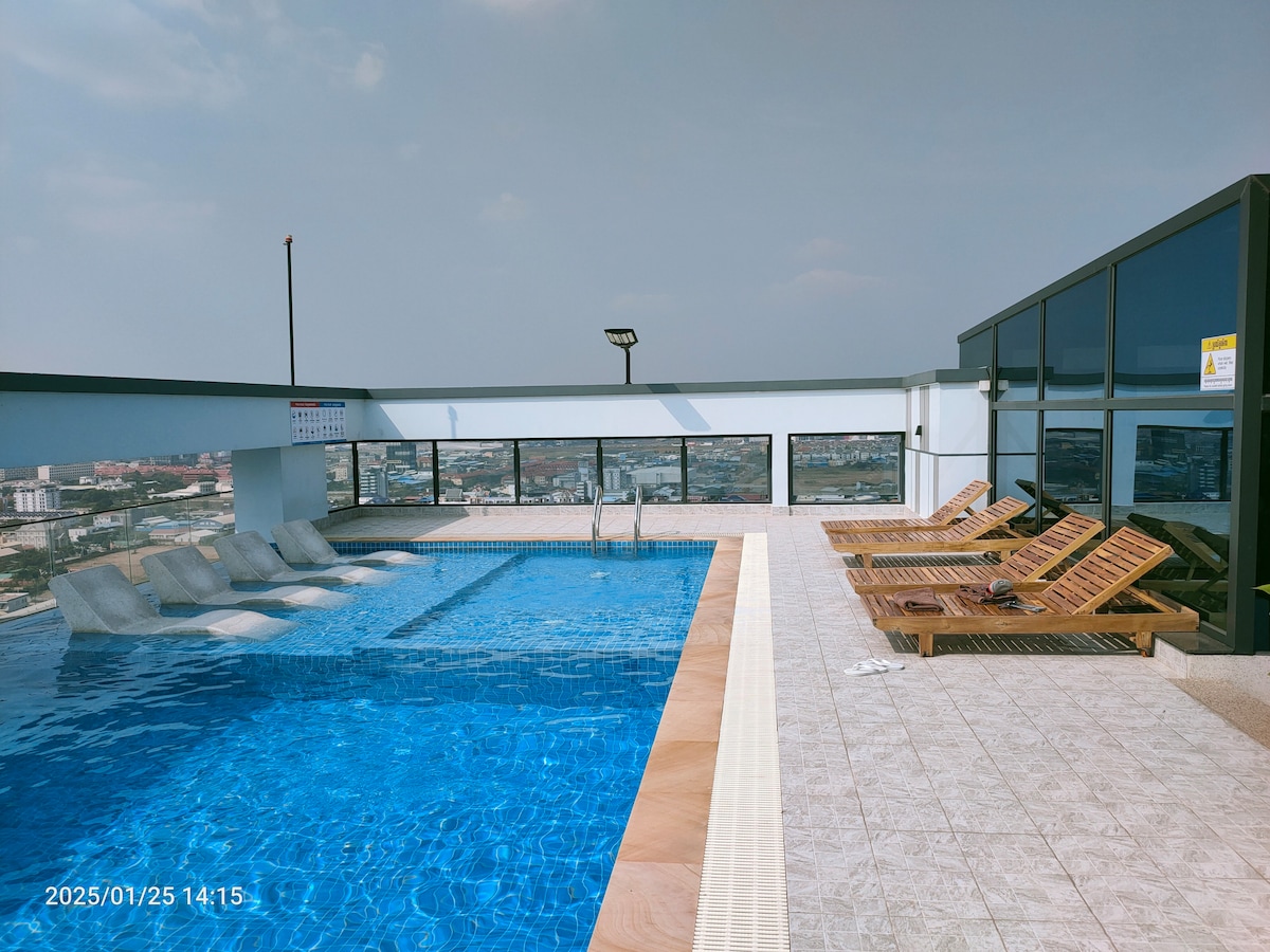 New High Rise 28 floor Building: "Residence H" - Sen Sok , Phnom Penh - Comfort & cozy 3-4 seat sofa. - 46" LG HD smart-TV - Fast WiFi internet with VPN - Top eq. kitchen with 4 seat dining - Fridge/Freezer , coldwater/icecube - Two large bedrooms. (Main bedroom with 32" HD TV & sep. shower) On top floor: - Large infinity swimmingpool 25m with kids pool & relaxing sunchairs. - State of the art Gym - Sauna & steam - Sky Bar with drinks beers & snacks