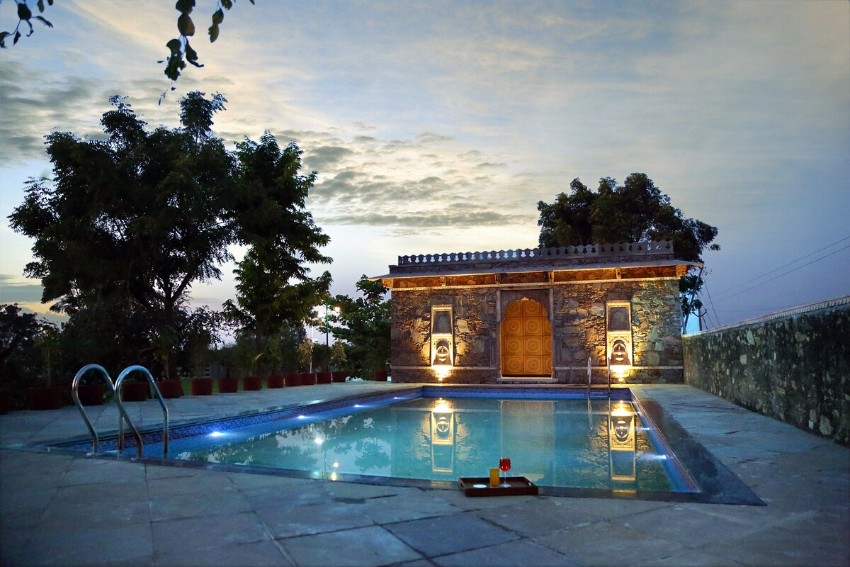Luxury Farmhouse Retreat near Udaipur | Private Pool & Scenic Views Escape to a serene luxury farmhouse near Udaipur, surrounded by lush greenery and mountain views. Perfect for families, couples, and groups, it offers a private pool, spacious lawns, cozy bedrooms, and modern amenities. Enjoy bonfire nights, home-style meals on request, and a peaceful retreat just 20 minutes from the city. Ideal for relaxing getaways, celebrations, and nature lovers. Highlights: