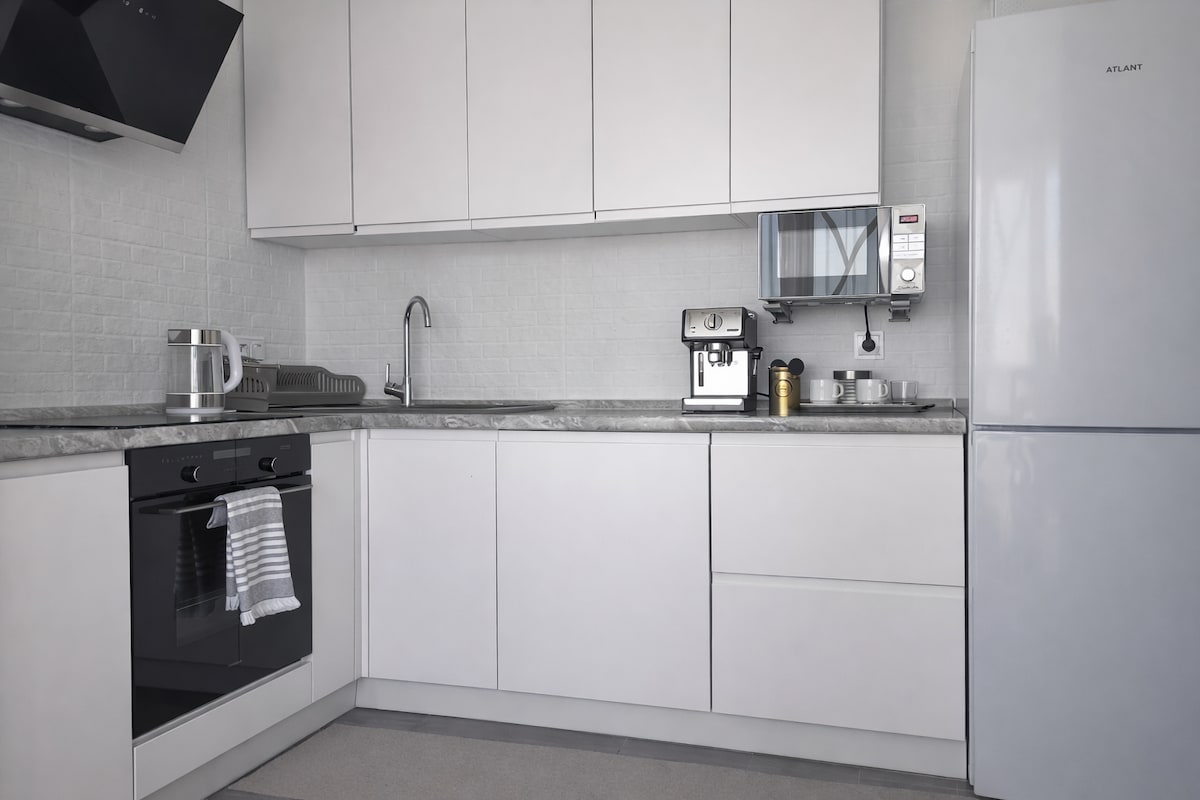 Stylish riverside apartment in Riviera complex with panoramic Southern Bug River views. Watch sailing boats while enjoying espresso from the De'Longhi machine. Features: open-plan living with fireplace & Smart TV, fully equipped kitchen, king-size bed with AC, modern bathroom, workspace. Safe, quiet area with fresh air. Sandy beach with café nearby. Free parking. Supermarket & pharmacy — 3 min walk. Washer, hairdryer, bathrobes, slippers, linens included.