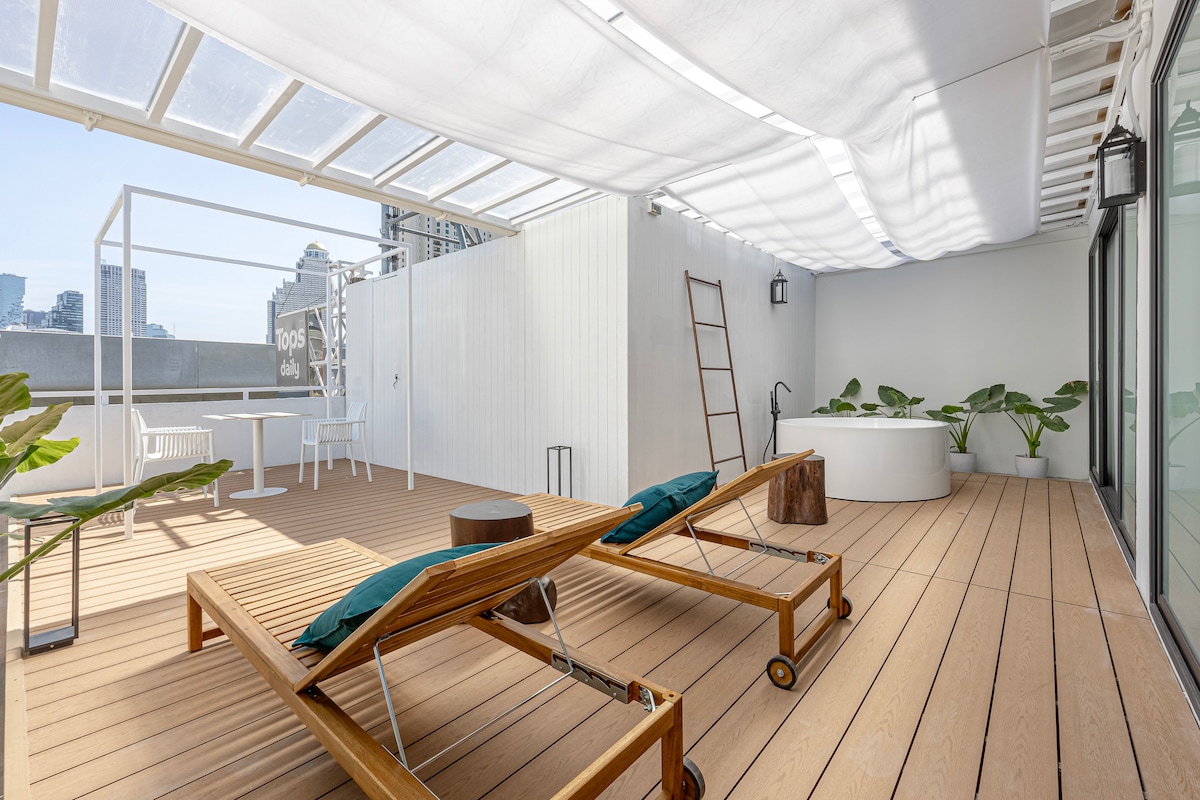 Descubre el lujo y la creatividad en nuestra elegante suite de luna de miel en la azotea. Este espacio meticulosamente diseñado ofrece una relajante bañera al aire libre y una ducha rejuvenecedora. La despensa bien equipada añade comodidad, mientras que una cama tamaño king garantiza una noche de descanso. A solo 3 minutos a pie de Icon Siam, nuestro refugio combina a la perfección estilo y accesibilidad. Reserva ahora para disfrutar de una estancia inolvidable en el corazón de la ciudad.