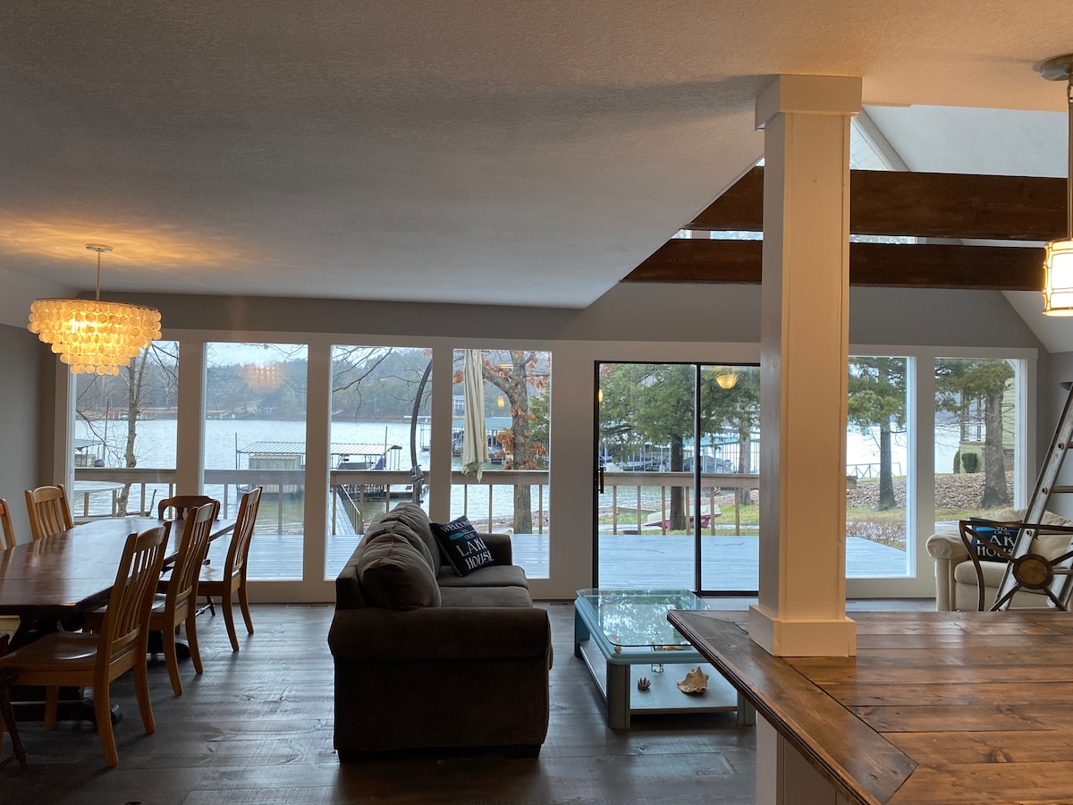 Waterfront home w dock at 9mm in quiet cove looking up the main channel. Newly updated interior is clean and comfy w modern touches. Location is great if you want to get out and about or just enjoy some peace/quiet. Asphalt access to the start of drive. Home looks down the main channel but inside no wake zone. Dock has swim platform w great sun/quiet water. Boat lift & 2 PWC lifts available $. We also have a canoe & lilly pad for rent. Each bdrm has a queen bed & both couches pull out.