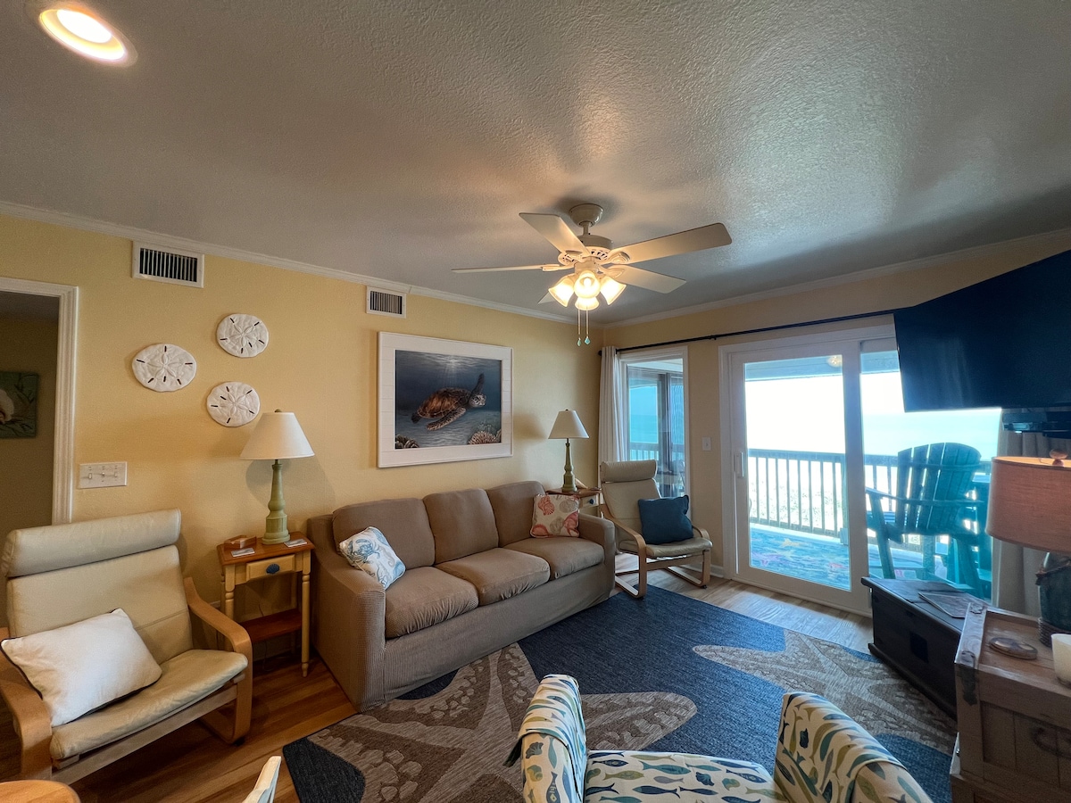 OCEANFRONT, apartamento en el segundo piso en el corazón de Duck, Carolina del Norte, a pocos minutos de la playa, tiendas, restaurantes y carriles bici públicos en esta encantadora ciudad. ¡Nuevos suelos, electrodomésticos, cocina totalmente equipada y ropa de cama cómoda complementan este refugio vacacional! Las comodidades incluyen una piscina comunitaria, una terraza en la cima de la duna y un paseo marítimo comunitario hasta la playa. Cómoda y amplia sala de estar para 5 personas. Gran terraza de 10 x 14 ideal para disfrutar del café de la mañana relajándose. Tenis, pickleball/baloncesto y parque infantil para niños.