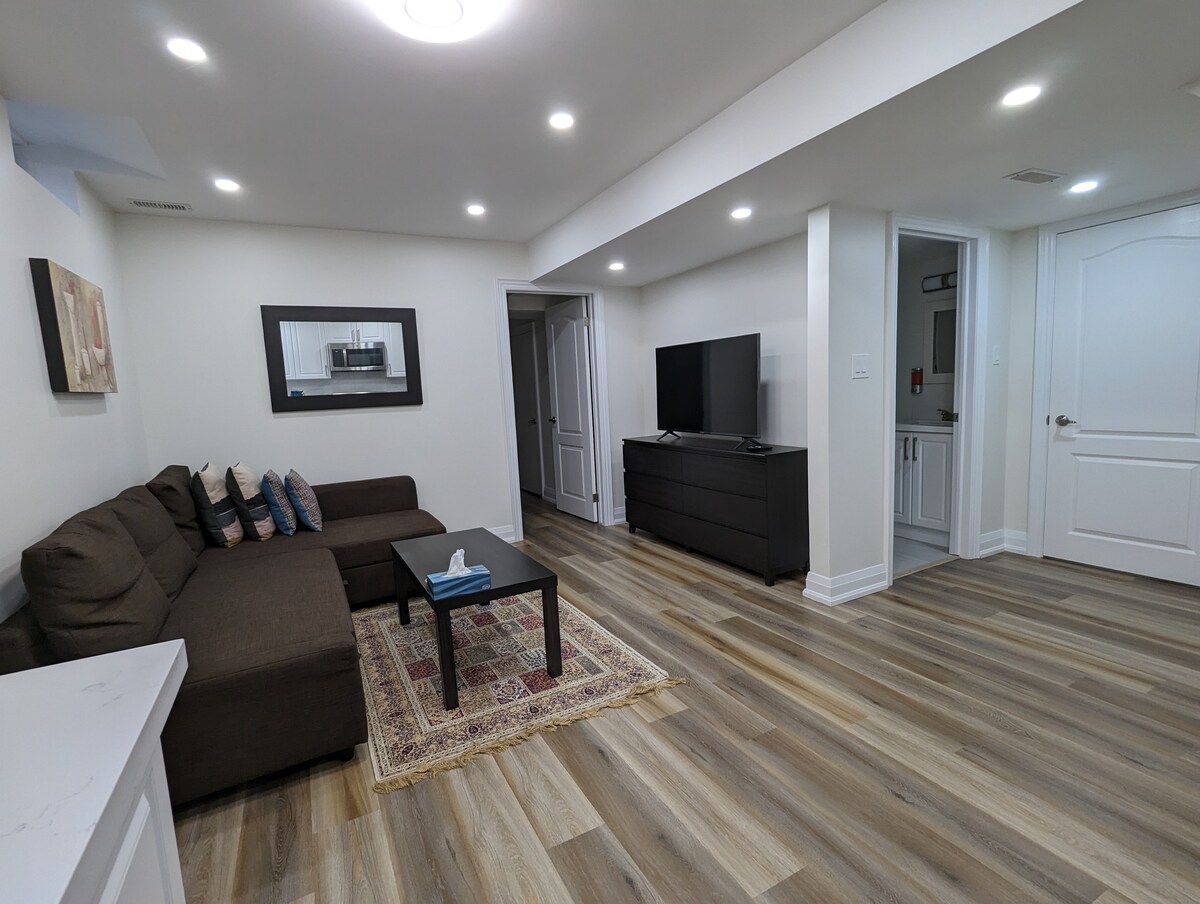 Tenemos un lugar ideal para ti, independientemente de si es para trabajar, disfrutar o pasar tiempo en familia. La suite recientemente reformada incluye: - Entrada independiente sin llave. - 2 dormitorios con armarios - Salón con TV de 55 pulgadas - Cocina completa con almacenamiento y comedor. - 2 baños completos (1 en suite) - 2 plazas de aparcamiento en las instalaciones - Lavandería - Wifi y mucho más. Cargador RÁPIDO de vehículos eléctricos: comprueba la disponibilidad (15 USD/carga). ¡UBICACIÓN CÉNTRICA! A pocos pasos de Upper Canada Mall, tiendas de comestibles, restaurantes, senderos, parques, campo de golf, Costco, Walmart, autopista, Go y mucho más.