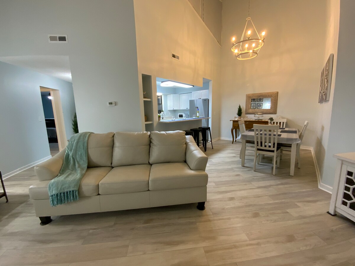 Olvídate de las preocupaciones en este gran alojamiento: ¡es un oasis de tranquilidad! Una vez que entres en la casa, olvídate de todas tus preocupaciones y disfruta de una estancia sin estrés. La casa tiene una cocina totalmente equipada, comedor en la mesa o mostrador para hasta ocho personas y una amplia sala de estar con techos de 22 pies y grandes ventanales para dejar entrar la luz natural. Disfruta de comidas, café por la mañana o una bebida nocturna de tu elección en el gran porche privado y protegido, mientras disfrutas de una bonita vista del campo de golf y el estanque.