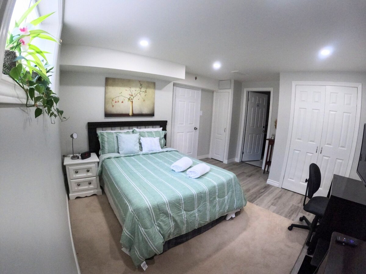 The PERFECT choice for you (and/or yours). You'll enjoy your cozy, warm (in Winter) and cool (in Summer) stay in this modern and bright, 2-bedroom (basement ) self contained with own entrance apartment in our home for 1-3 people. Quiet, residential area with tree-lined streets. Minutes walking to Guelph University, Downtown Guelph, amenities and numerous parks, trails and rivers (rent a canoe or kayak). Looking forward to welcoming you. ( our cat does not go in basement!)