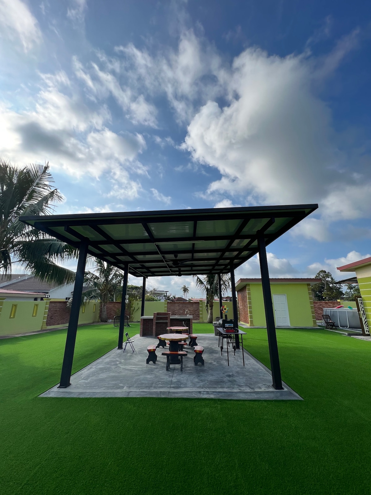 Cómoda vista al jardín de la piscina (máximo 24 personas) 1) Con 5 dormitorios con aire acondicionado - Habitación 1 (2 camas tamaño queen) - Habitación 2 (camas de dos pisos - 1 cama tamaño queen 2 camas individuales ) - Habitación 3 (2 camas tamaño queen) - Habitación 4 (1 cama tamaño queen + 1 cama individual). - Habitación 5 (camas 2Queen) 1)Amplia sala con mesa de billar 2) Piscina lúdica de 20 pies x 18 pies para adultos y niños con 3)Múltiples juegos : Mahjong, Rummy y Dices 4) Área de cocina: cocina de inducción, microondas, dispensador de agua y utensilios de cocina