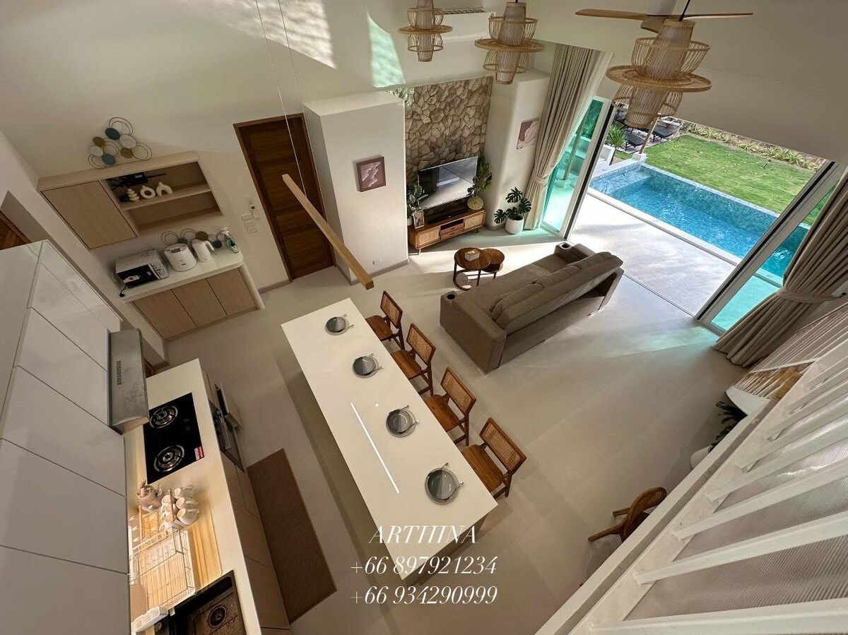 200 sqm villa On 500 sqm land offers luxury, privacy, and convenience in one of Koh Phangan’s best locations. -It features two master bedrooms with en-suite bathrooms, -plus an additional sperated bedroom for guests or office use. -high speed internet. -4K 65-Inch TV -High-Quality Fully Equipped Kitchen -Private Saltwater Swimming Pool -Open-Plan Living & Dining Area Designed for indoor-outdoor -High-Quality Furniture & Amenities – Stylish, comfortable-Secure privet Parking