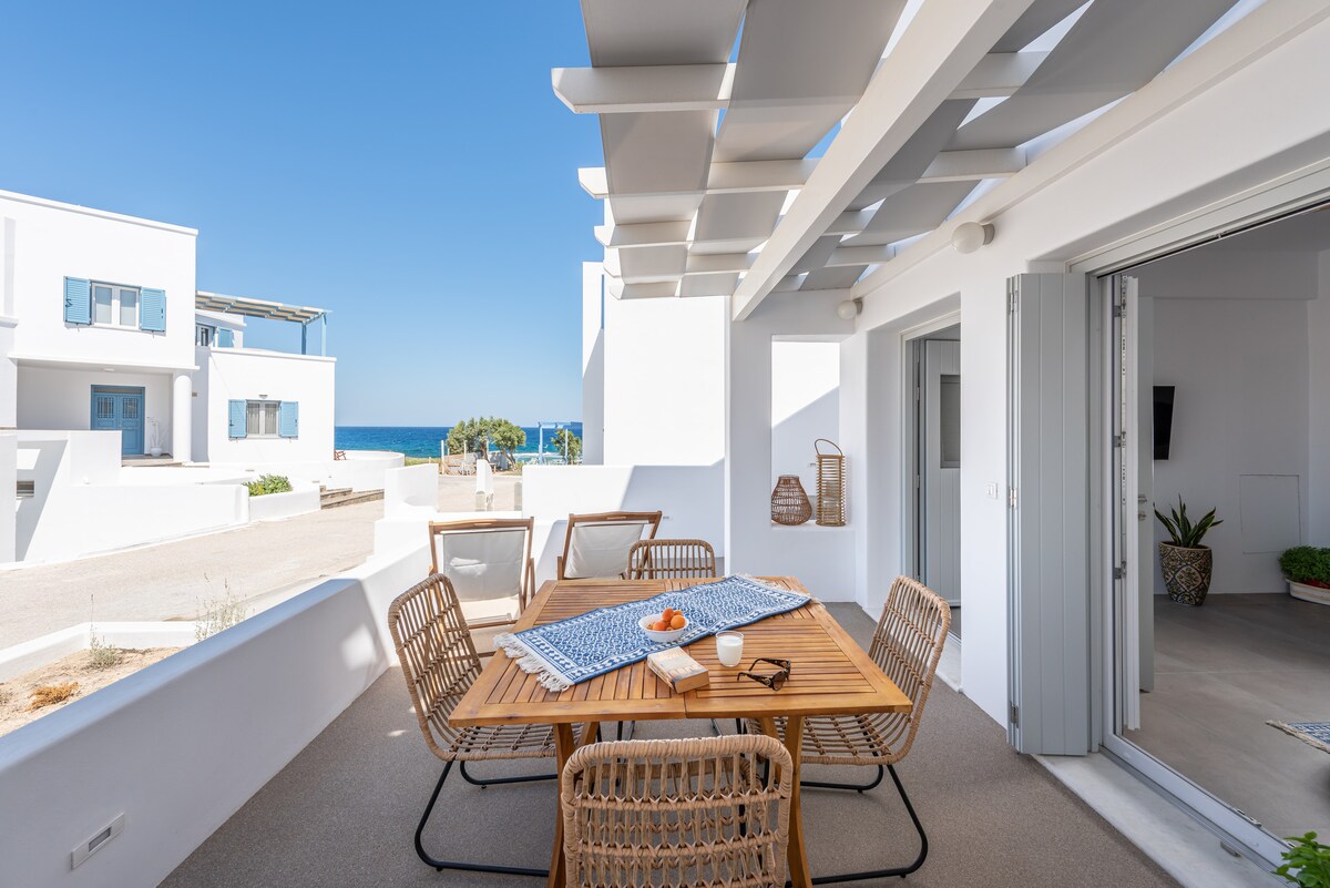 Una casa de playa de espacio abierto, de 60 m² para 6 personas con 1 cama de matrimonio, 2 sofás cama y una segunda habitación con 2 camas individuales muy elegantes y cómodas. Está decorada con un estilo boho y un diseño acogedor combinado con la cultura cicládica. La casa tiene acceso directo a una terraza con vistas al mar, con una gran mesa de comedor. Está situada en una pequeña bahía, con rocas blancas lunares similares a Sarakiniko que forman una cala aislada frente a la casa, junto con Aqua House 1 y 3. Cesta de bienvenida con productos locales.