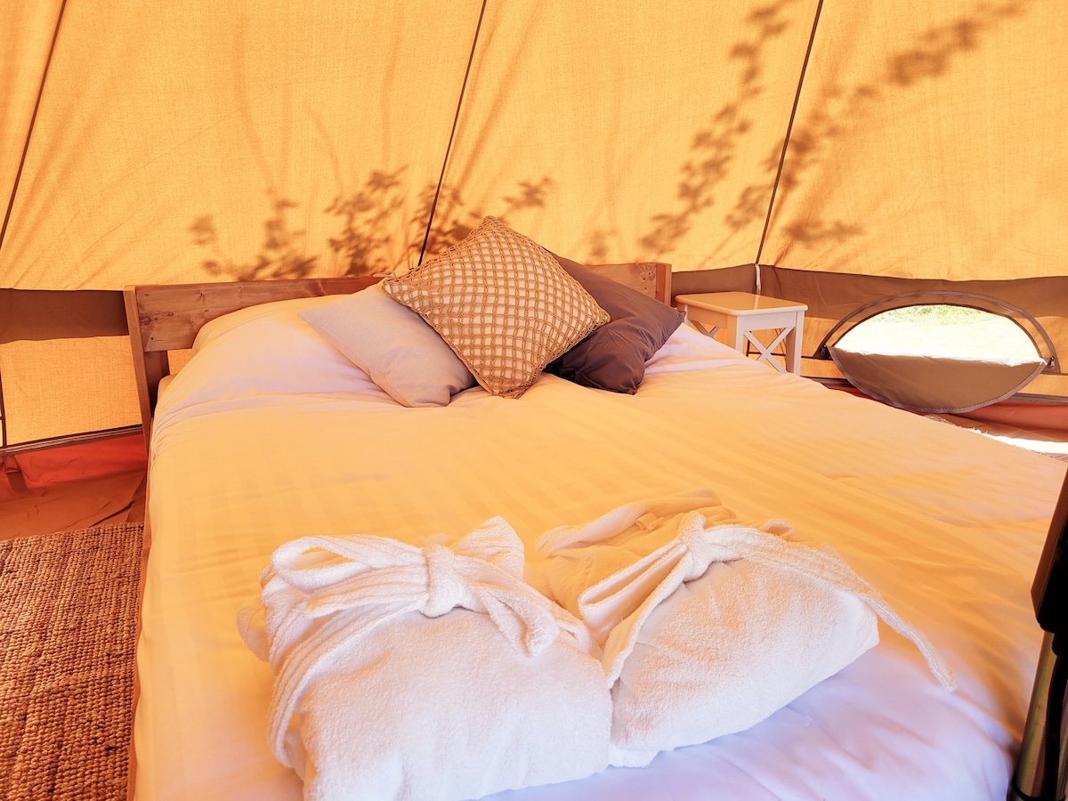 Disfruta del hermoso entorno verde de esta propiedad nueva. De Belltent está completamente amueblado para una experiencia de acampada de lujo con nevera, manta eléctrica, frascos, estufa de leña, cafetera, hervidor de agua y comedor. La tienda de campaña está en una planta donde disfrutar de las vistas sin obstáculos. ¡Al llegar, tu cama está hecha y la barbacoa de trípode! La fontanería acogedora y limpia está a pocos pasos y está bien mantenida. ¡Disfruta la hermosa cocina nueva al aire libre!