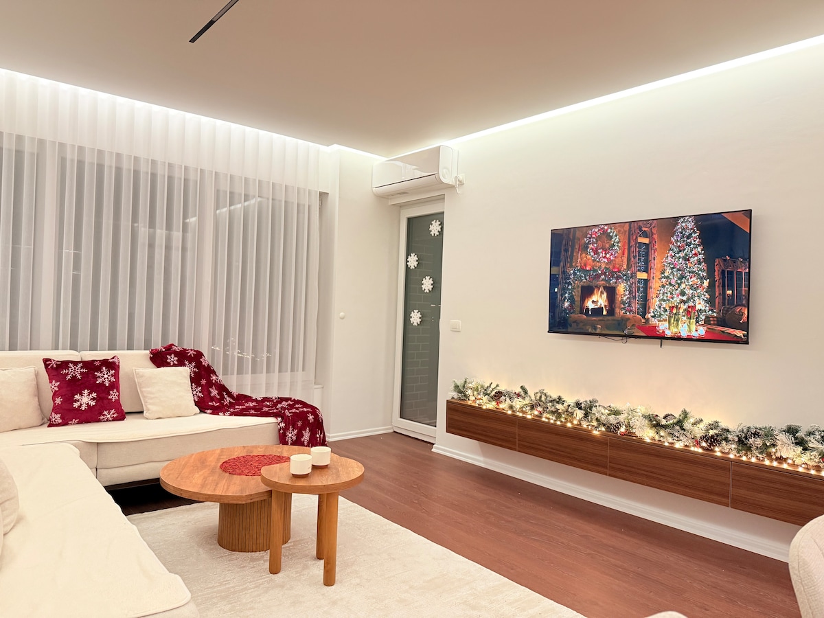 This cozy Prishtina apartment blends city charm with calm comfort. Warm light filters through soft curtains, highlighting the inviting sofa and serene tones, while the window opens to a beautiful view of the city’s heart.