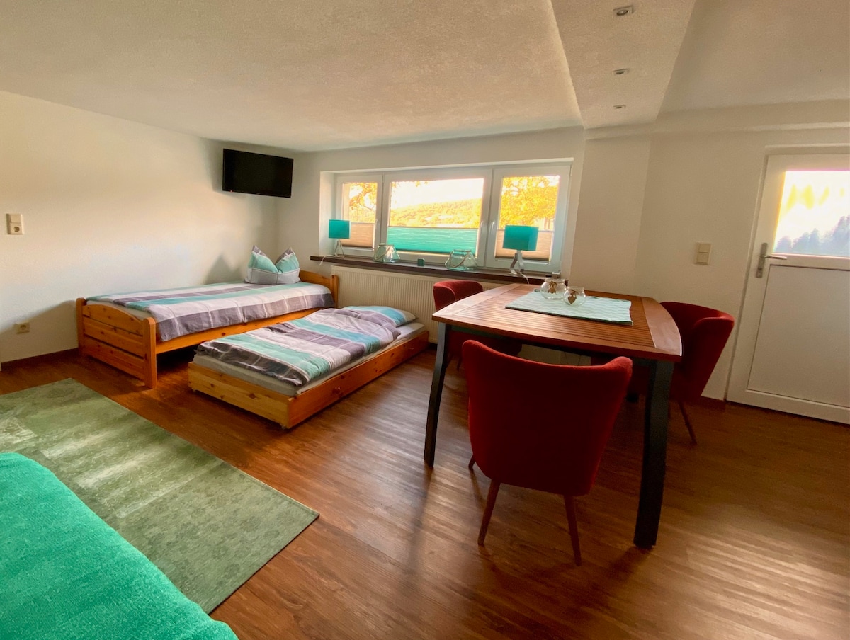 Estimados huéspedes potenciales: Tanto si estás de paso, como si vienes para una escapada corta o más larga, nuestro apartamento es de rápido acceso y un buen lugar para relajarse por la noche, por ejemplo, en el balcón con vistas. El sofá cama en la sala de estar es muy cómodo, por lo que puedes dormir bien en dos habitaciones. En el pueblo hay una hermosa piscina al aire libre y buena gastronomía, a su alrededor hay mucho bosque. Nuestra cafetería tiene desayuno entre semana a partir de las 6 o 7 en punto los fines de semana.
