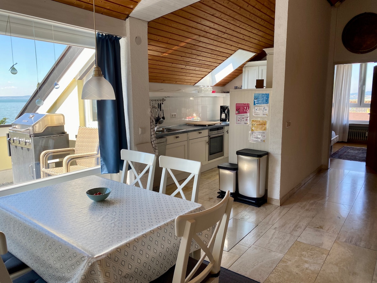 Wir vermieten unsere charmante Dachgeschosswohnung, 52 m². Sie besteht aus Küche/ Wohnzimmer/ Schlafzimmer/ Bad und Gäste-WC. Die Küche ist vollwertig eingerichtet inkl. Spülmaschine. Das großzügige Bad mit Eckbadewanne und separater Dusche lädt zum Träumen ein. Genießt Euren Morgenkaffee auf dem Balkon mit See- und Bergsicht.