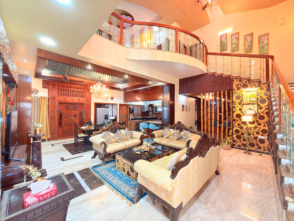 Twilight Terrace es una impresionante villa triplex en Jayanagar, Bangalore, diseñada para una estancia lujosa y cómoda. Este refugio de 3 BHK tiene capacidad para 8 huéspedes y cuenta con múltiples pasillos espaciosos, un teatro privado con sillones reclinables de primera calidad y una impresionante terraza de doble altura con jardín y bar. Disfruta de las vistas panorámicas del horizonte mientras te relajas con estilo, lo que la convierte en la escapada perfecta para familias o grupos que buscan una experiencia de estancia premium.