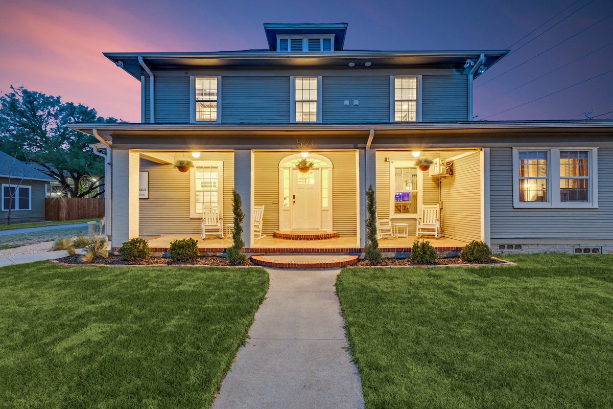 Craftsman home oozing with character and thoughtful touches, located just an 8 minute walk from the Denton Square. "The Fallon House: Craftsman" is the Main home on the property, with "The Fallon House: Cottage" nestled directly behind (available to book separately), making this the perfect landing place for small or large groups, alike! A cozy fireplace, serene secondary bedroom, rainfall shower, and lush primary bedroom provide guests with a luxurious getaway - for a weekend or for a while.