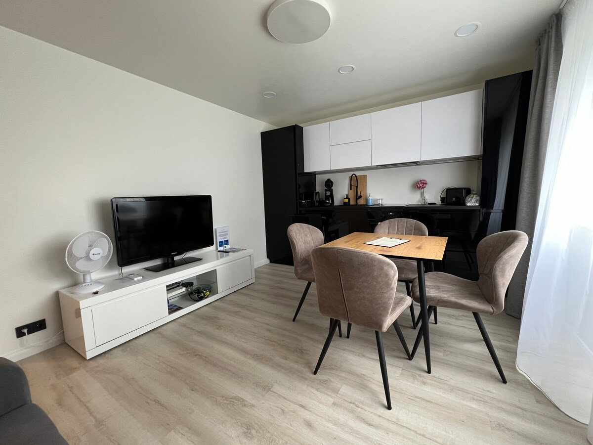Un apartamento acogedor y elegante con un interior. El sofá del salón tiene unas vistas preciosas y, después de un día lleno de aventuras, es un placer relajarse en la bañera. El apartamento, además de una cocina-sala de estar abierta, también tiene un dormitorio separado, un baño con inodoro y un hall de entrada. El dormitorio tiene una cama doble de 140 cm, y en el salón se duerme en colchones de 2x 80x200 cm. La cocina está equipada con una placa de inducción, horno eléctrico, nevera, microondas, hervidor de agua, utensilios de cocina y vajilla y cubiertos. La tienda de comestibles más cercana está a 150 m Plaza central de Kärdla 1000 m Playa a 1900 m
