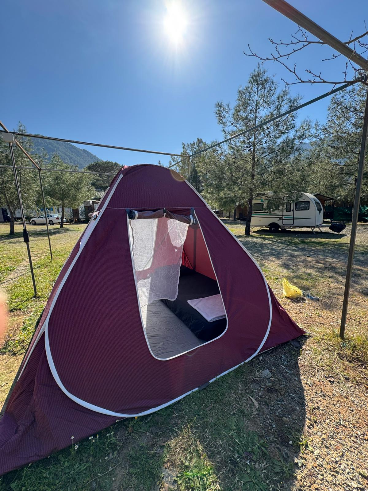 La tienda de campaña donde te alojarás está situada junto a la piscina. Una auténtica experiencia en la naturaleza a la sombra de árboles de 300 años. Por la noche, las estrellas se acompañan de los sonidos de los pájaros por la mañana. Siente el Olimpo en la tienda más lujosa de Turquía. Nuestra tienda de 12 m2 tiene ventilador, energía de 220 V, camas dobles de 150*200 y juegos de sábanas acolchadas Pierre Cardin. Simplemente disfrute de una estancia cómoda en la naturaleza. ¡Coge tu bolsa y ven!