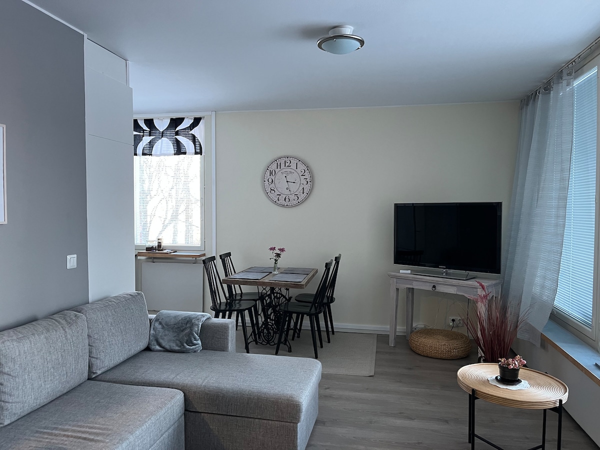 Sencillo en este lugar céntrico. El apartamento tiene una plaza de aparcamiento gratuita y aire acondicionado en verano. El apartamento renovado se encuentra a una manzana de la plaza, a solo 350 metros a pie de la estación de tren. Desde la ventana se puede ver la torre de la catedral, ¡y la vida de restaurantes de Kuopio le espera a solo dos manzanas de distancia! El apartamento tiene una cama doble de 160 cm de ancho y, si es necesario, el sofá también puede alojar a una persona adicional (NOTA: área para dormir limitada; 180 cm×85 cm).