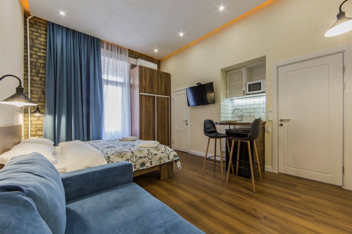 Nos complace presentarle un hermoso estudio tipo hotel en un edificio histórico, construido en 1905 año, ubicado en el centro histórico de la ciudad y está en la lista de monumentos arquitectónicos. Ofrecemos a nuestros huéspedes unas vacaciones en apartamentos nuevos, después de la renovación, con techos altos y un patio tranquilo. Salón bien diseñado con una cama grande, un mini kittchen compacto equipado. El diseño está creado para su comodidad y calidad. 43 "ELED-Smart TV con TV por cable, Internet, WIFI