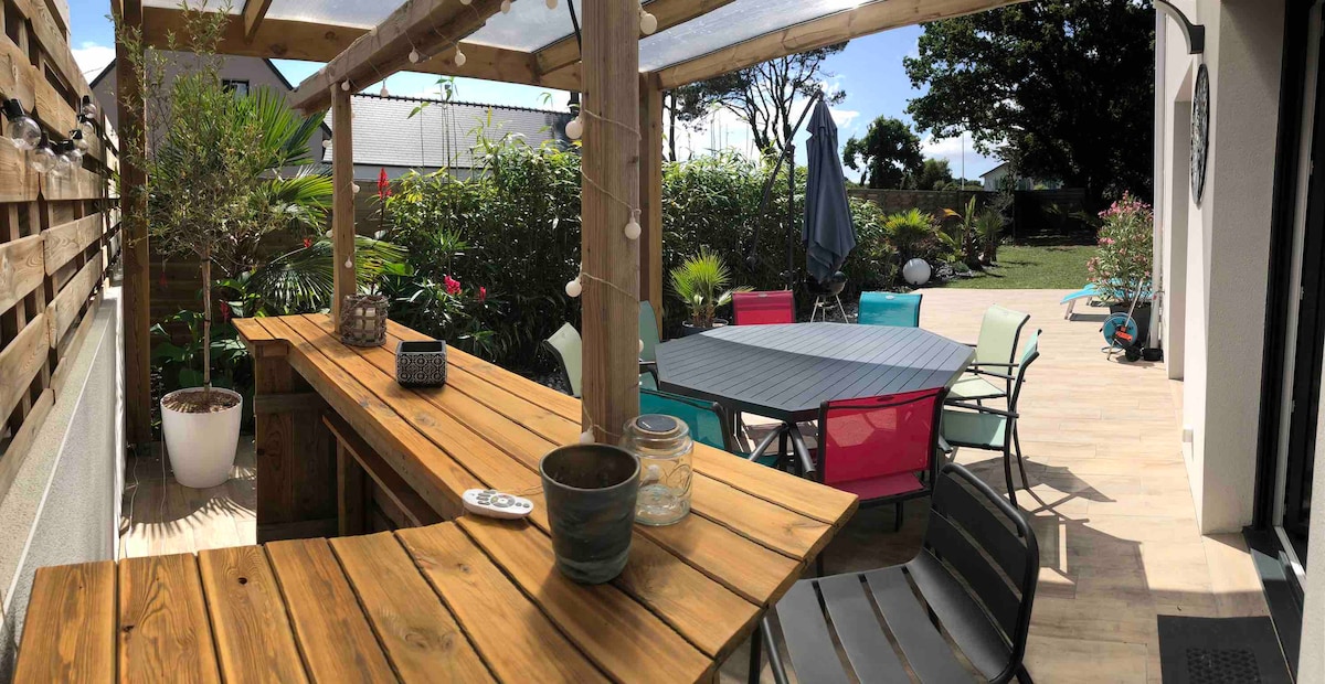 Le ofrecemos una villa luminosa de una sola planta con bañera de hidromasaje (Sdb) y jardín soleado. Las playas, la costa salvaje, el supermercado, el puerto con tiendas y restaurantes están a poca distancia a pie en 5 a 10 minutos. La terraza de madera está equipada con tumbonas, sombrilla y una mesa de teca. El jardín arbolado de árboles frutales está completamente cerrado y sin vecinos. El chapoteo del agua del estanque de los peces rojos contribuye a la serenidad del jardín. Las camas están hechas a su llegada.