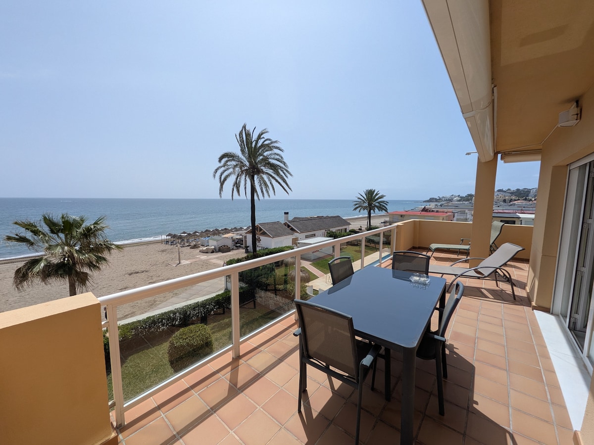 Cozy, bright, entirely renovated quality flat on the front line with sea views from the sunny and large balcony, both rooms and the bathroom. Features his and her shower, full kitchen, 2 tennis courts, 2 swimming pools (1 for children) large gardens, private beach area, free beach beds and private parking. We have a sandy beach with Blue Flag status and direct access to the sea boardwalk. Near Marbella and La Cala with 75+ restaurants and many shops walking distance. Strict cleaning in effect.
