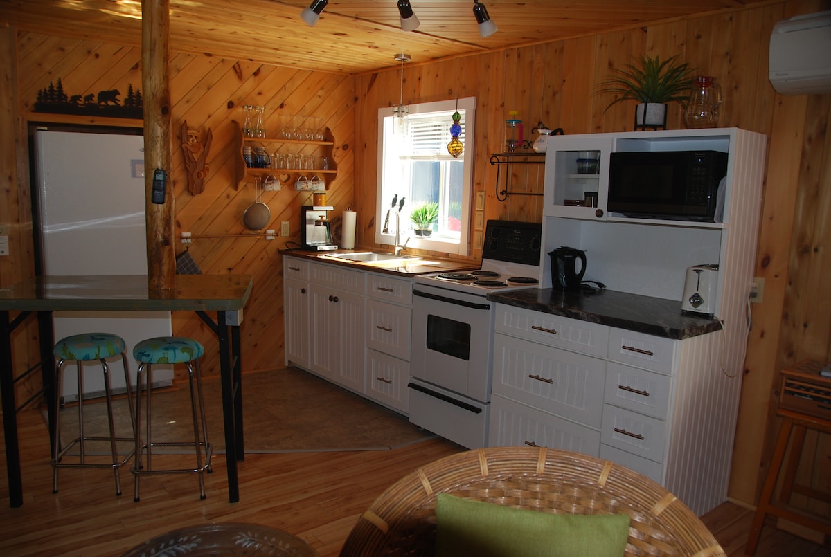 Habitación privada con entrada independiente en casa centenaria con baño completo y cama tamaño king, a solo unos pasos de la playa, el puerto deportivo y la tienda de chocolate en el corazón de Kagawong. A 10 minutos a pie de las cataratas Bridal Veil Falls por carretera o a 2 minutos a pie del impresionante sendero del río. Se proporciona café/té gratis, con cocina americana (nevera, microondas, horno tostador, etc.). Escaleras independientes hasta la habitación. Wifi de alta velocidad gratuito, TV de alta definición con múltiples servicios de streaming. Zona de estar al aire libre. Estudio de cerámica en el sitio.